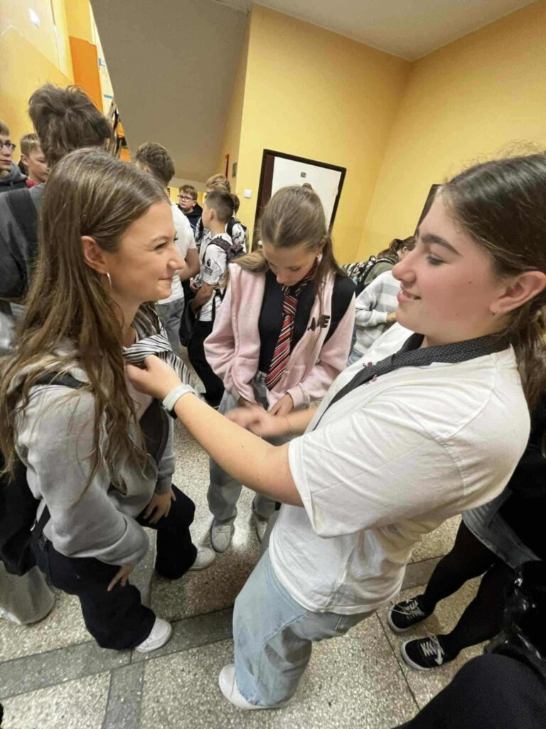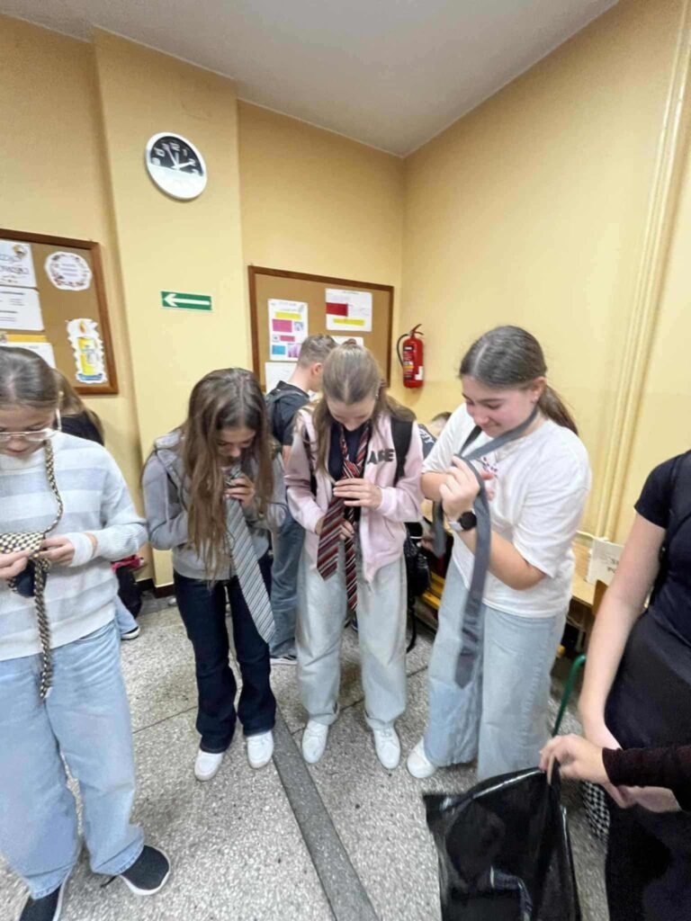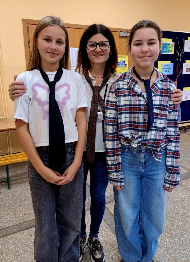Samorząd Uczniowski zorganizował też akcję nauki wiązania krawata, w której uczniowie mogli spróbować swoich sił i nauczyć się kilku sposobów wiązania.