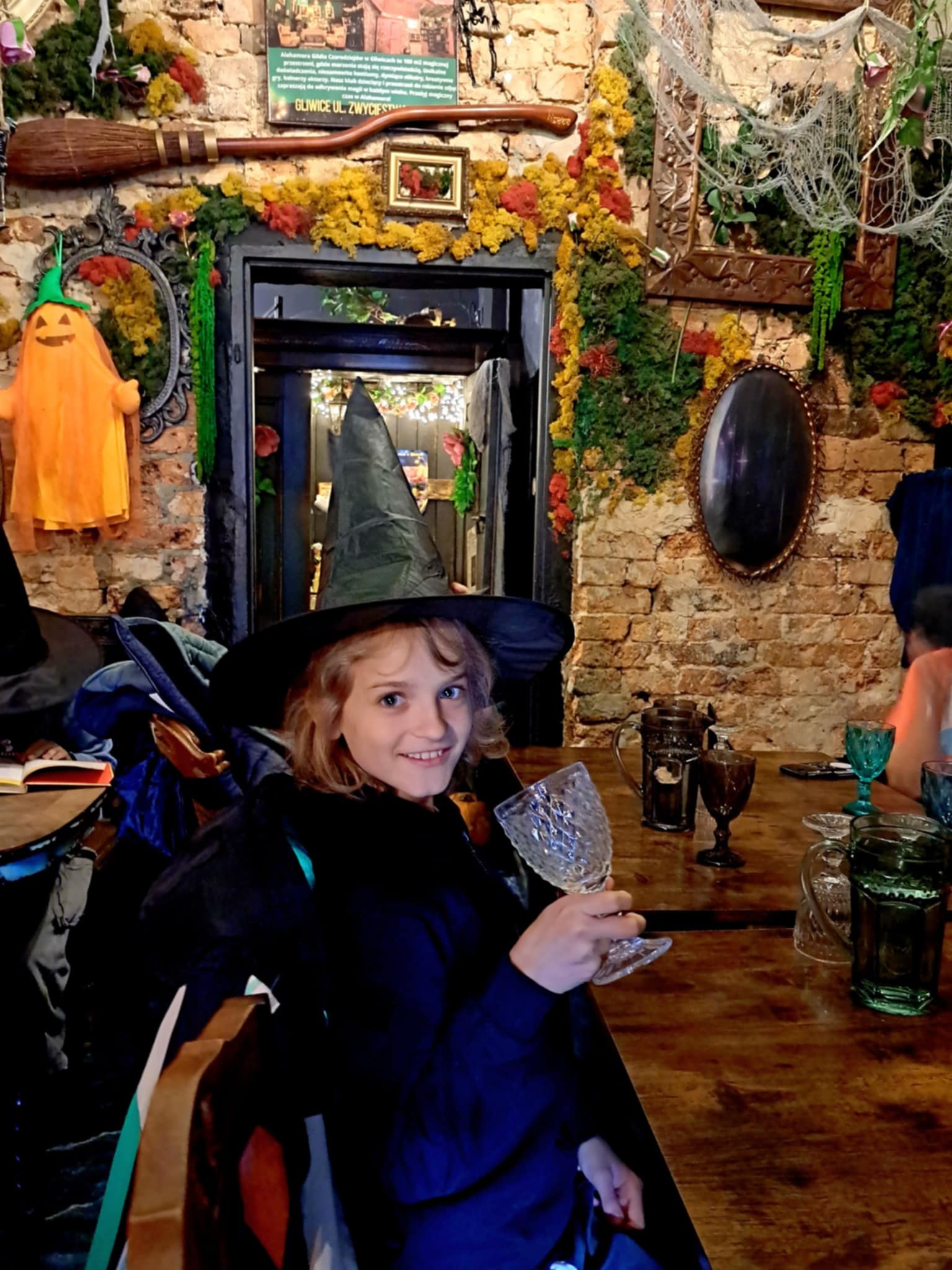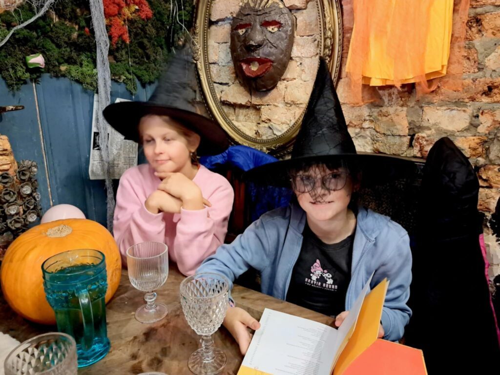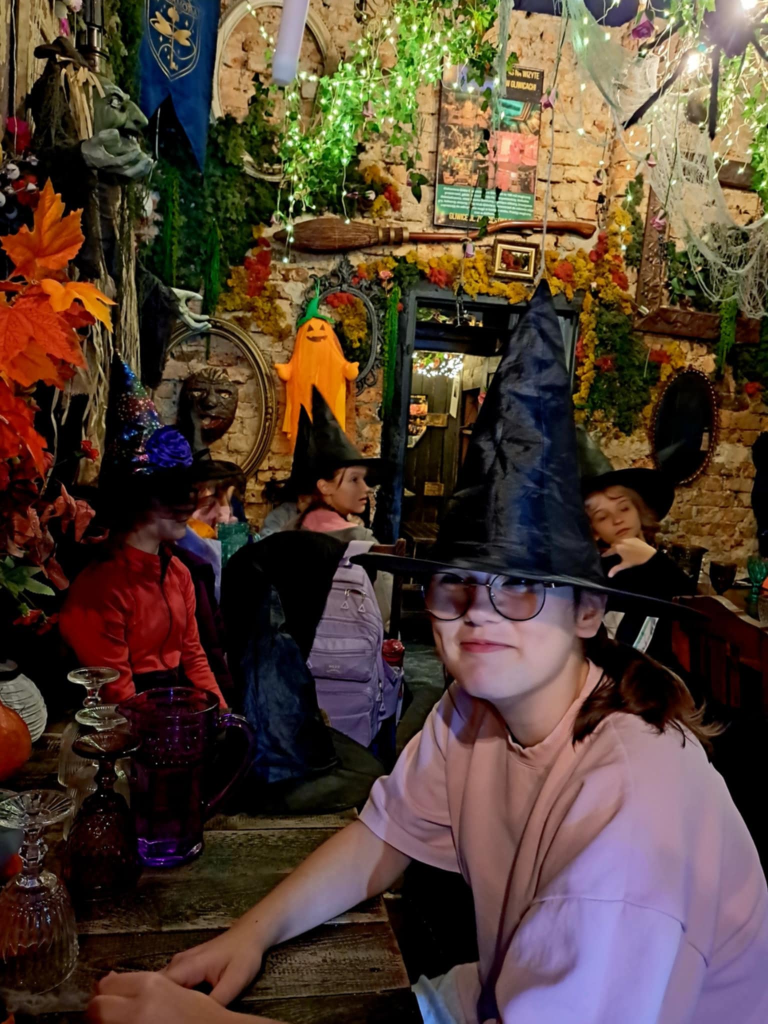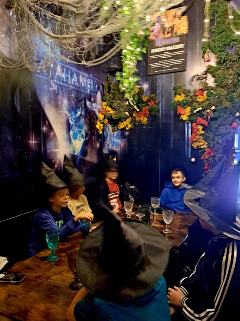 W czwartek 30.10.2025 uczniowie klasy Va i Vb wybrali się do magicznej kawiarni „Alahamora” Magiczna kawiarnia w Katowicach, gdzie czekały na nich niezwykłe warsztaty czarodziejskie. Dzieci przeniosły się w świat magii i tajemnic -tworzyły własne eliksiry, poznawały sekrety czarodziejskich zaklęć i brały udział w zagadkach i quizach o świecie magii. W kawiarni panowała wyjątkowa, halloweenowa atmosfera – migotały świece, wszędzie unosiły się pajęczyny i dynie z uśmiechami. Uczniowie mogli również spróbować magicznych przysmaków i napojów. To był dzień pełen uśmiechów, czarów i dobrej zabawy!