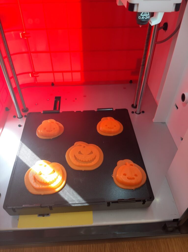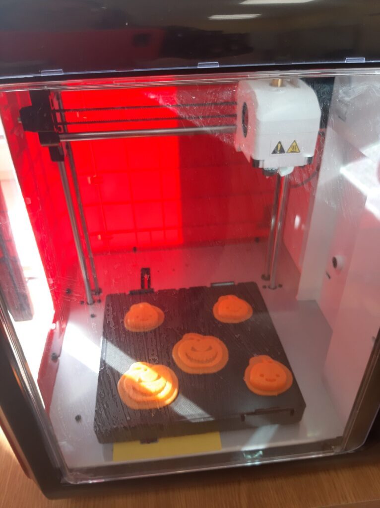 Podczas spotkań uczniowie zapoznali się z zasadą działania drukarki 3D, podstawowymi pojęciami związanymi z drukiem przestrzennym oraz zasadami bezpiecznej pracy z urządzeniem. Następnie, korzystając z programów do projektowania 3D, przygotowali modele zakładek w kształcie duszków oraz breloczków w kształcie dyni.