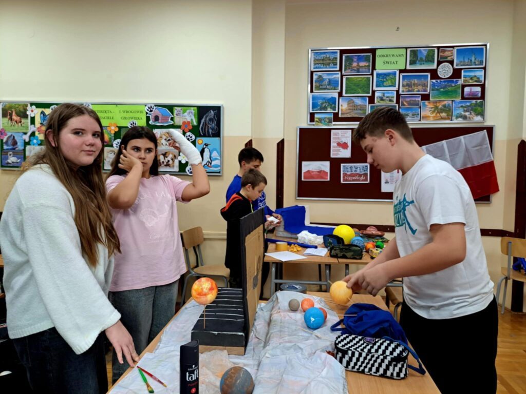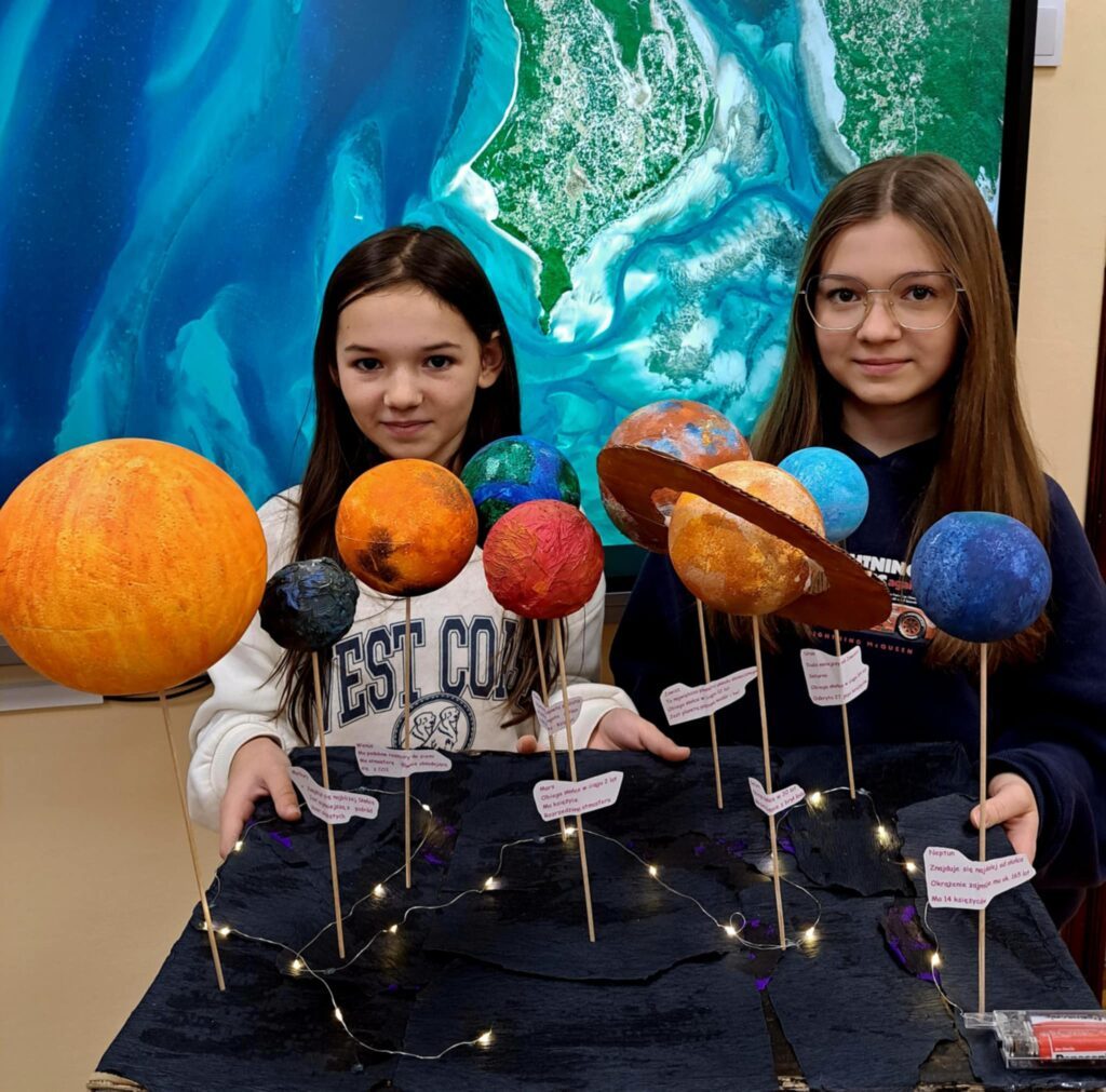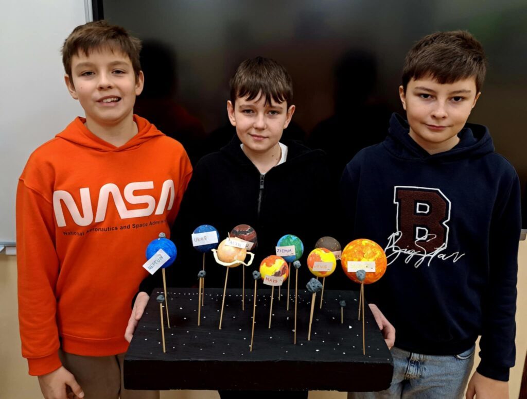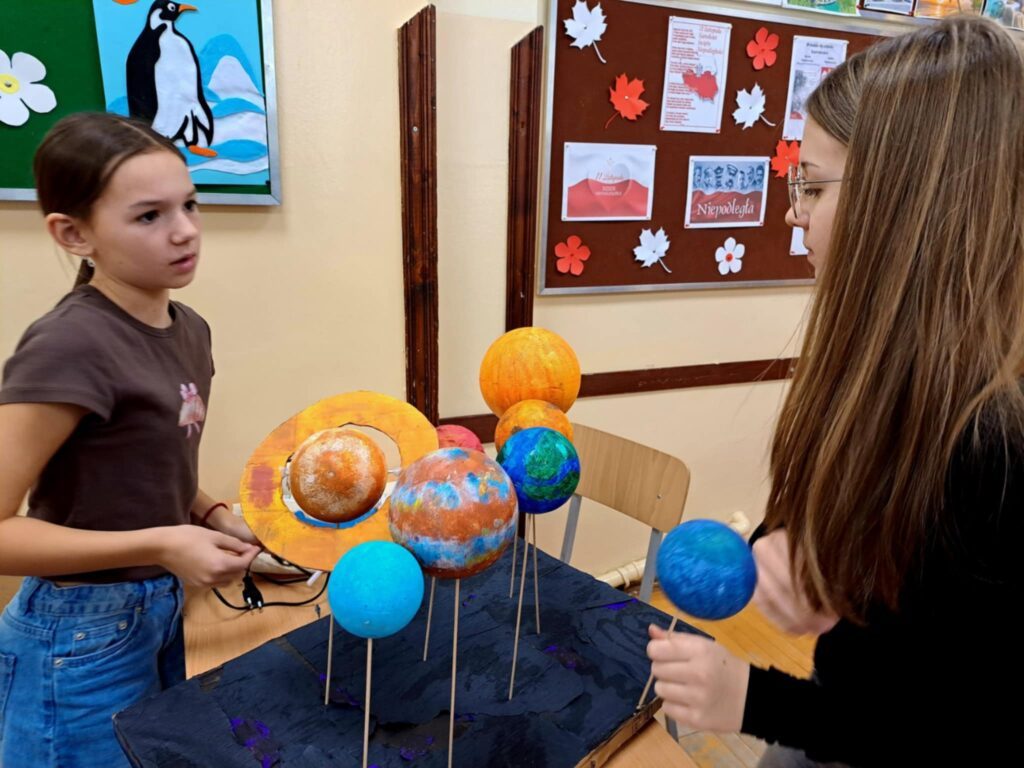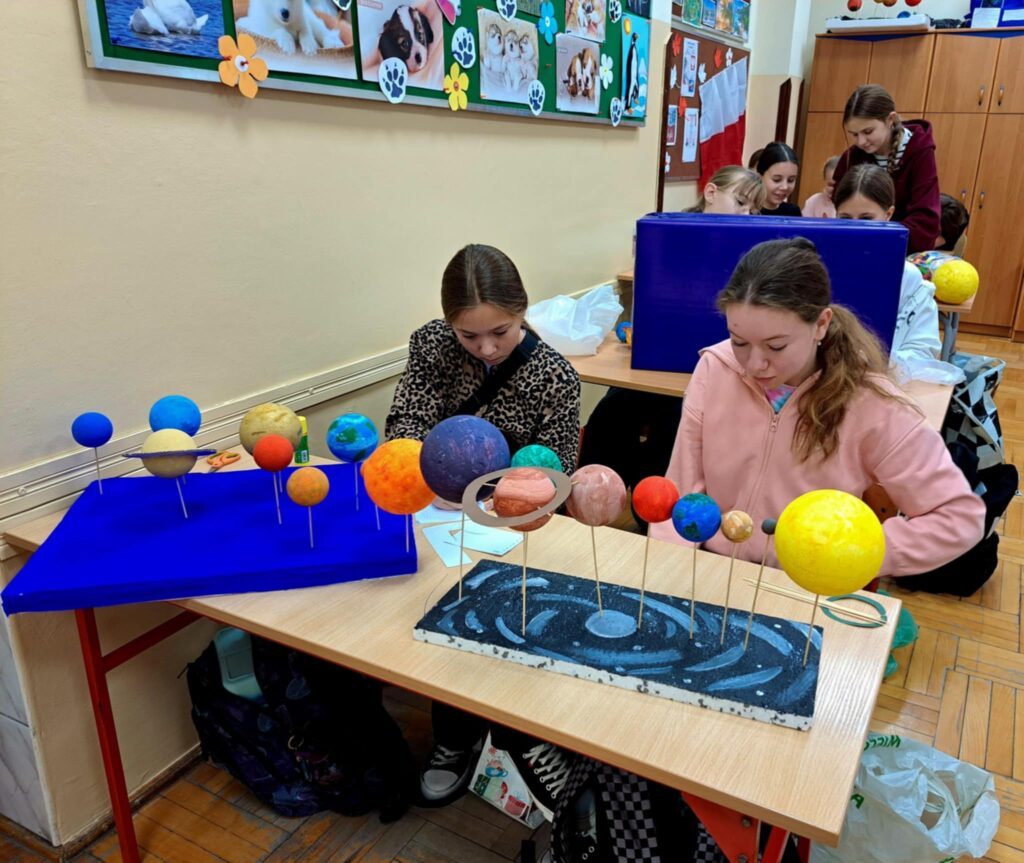 Uczniowie klas szóstych w ramach omawianych zagadnień z geografii dotyczących Wszechświata wykonali piękne modele przedstawiające Nasz Układ Słoneczny. Wszystko przygotowali własnoręcznie wykorzystując tutaj różnego rodzaju materiały. Niektóre prace posiadają swoje oświetlenie co bardzo urealnia wyobrażenie o kosmosie. Wśród modeli są i takie, które mają statki kosmiczne, ufoludków, meteoryty i wile innych elementów, które tam wysoko mogą zobaczyć astronauci i naukowcy.