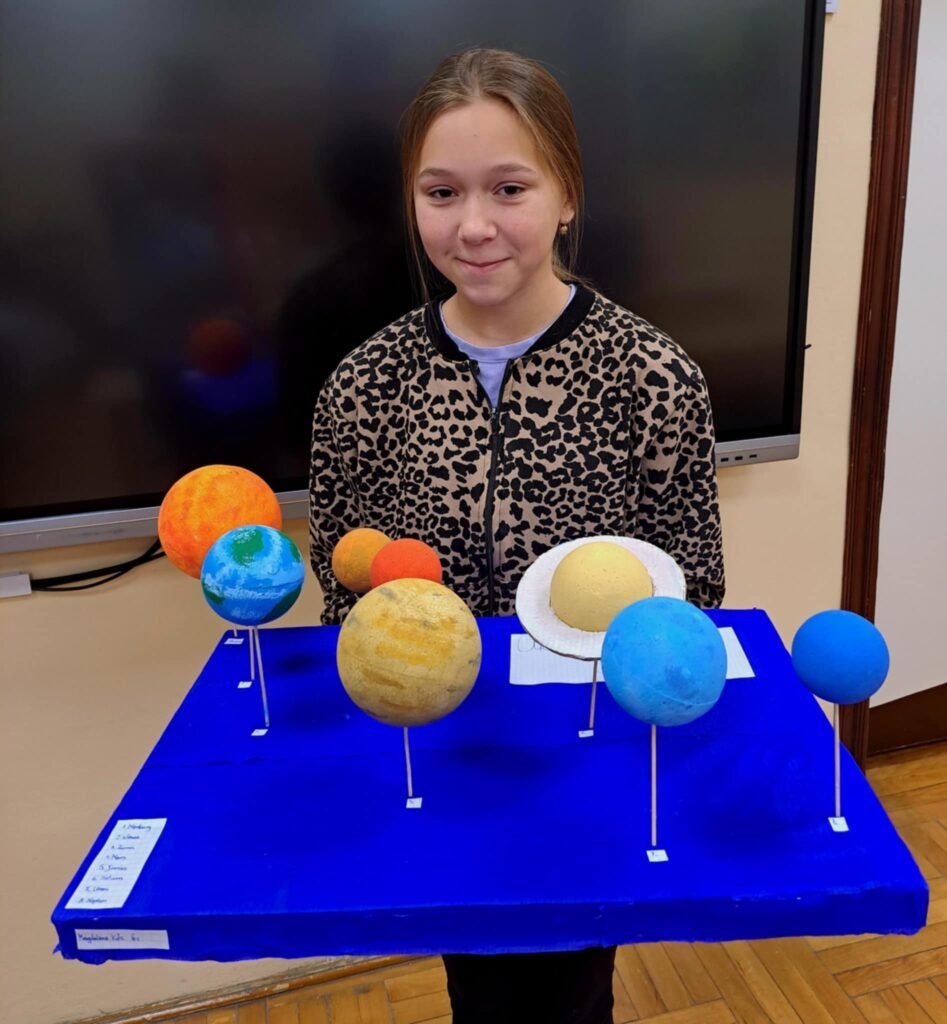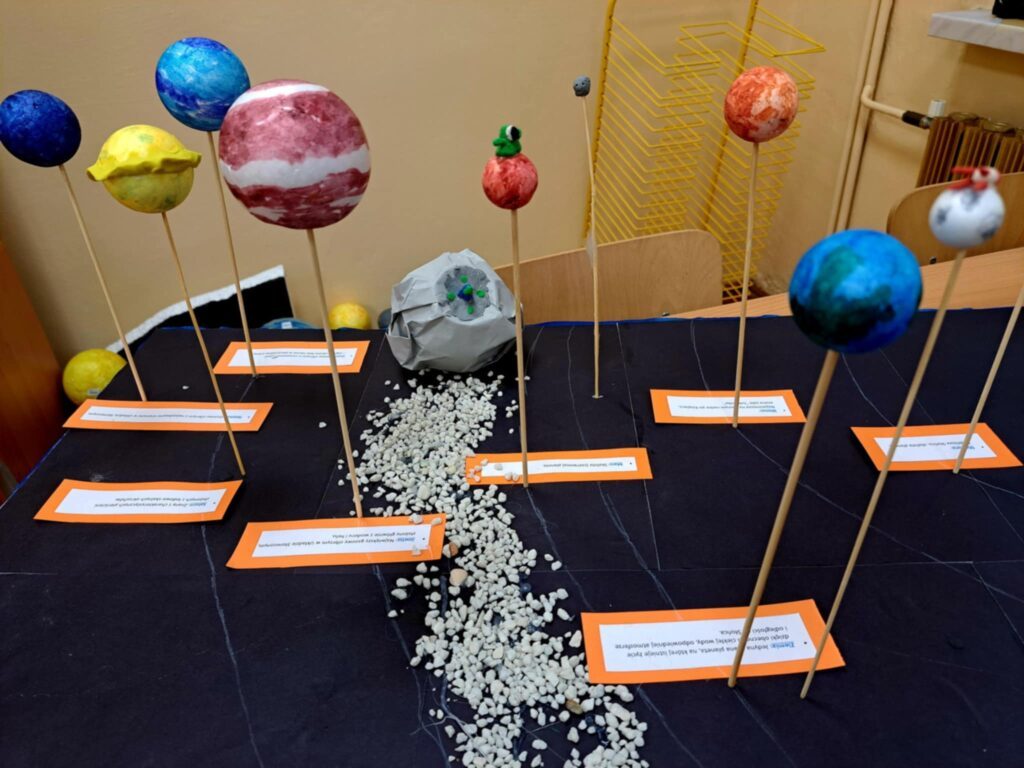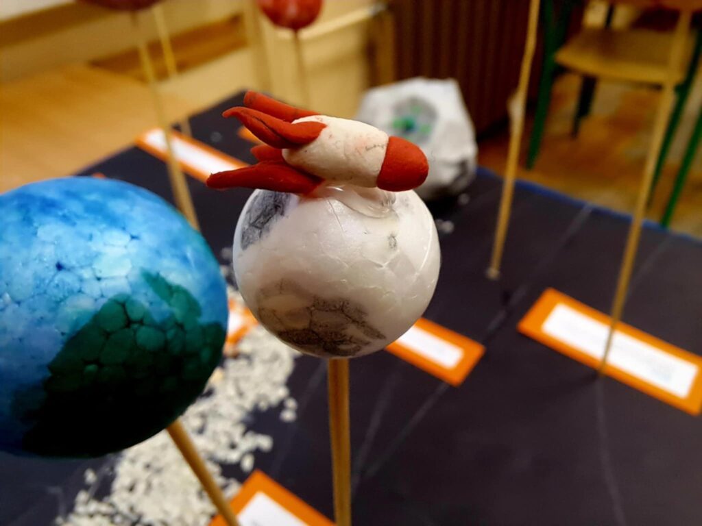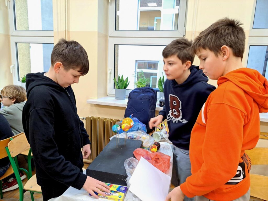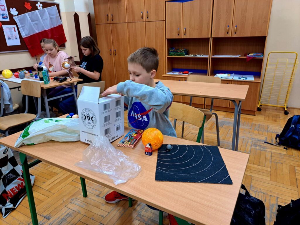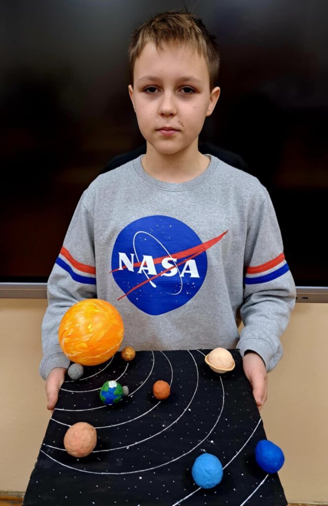 Uczniowie klas szóstych w ramach omawianych zagadnień z geografii dotyczących Wszechświata wykonali piękne modele przedstawiające Nasz Układ Słoneczny. Wszystko przygotowali własnoręcznie wykorzystując tutaj różnego rodzaju materiały. Niektóre prace posiadają swoje oświetlenie co bardzo urealnia wyobrażenie o kosmosie. Wśród modeli są i takie, które mają statki kosmiczne, ufoludków, meteoryty i wile innych elementów, które tam wysoko mogą zobaczyć astronauci i naukowcy.