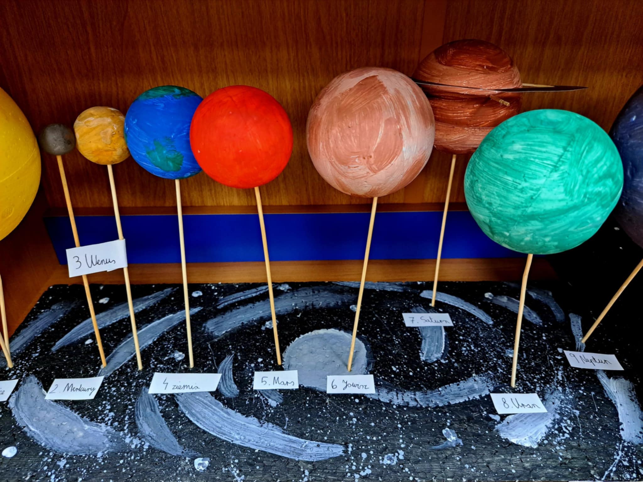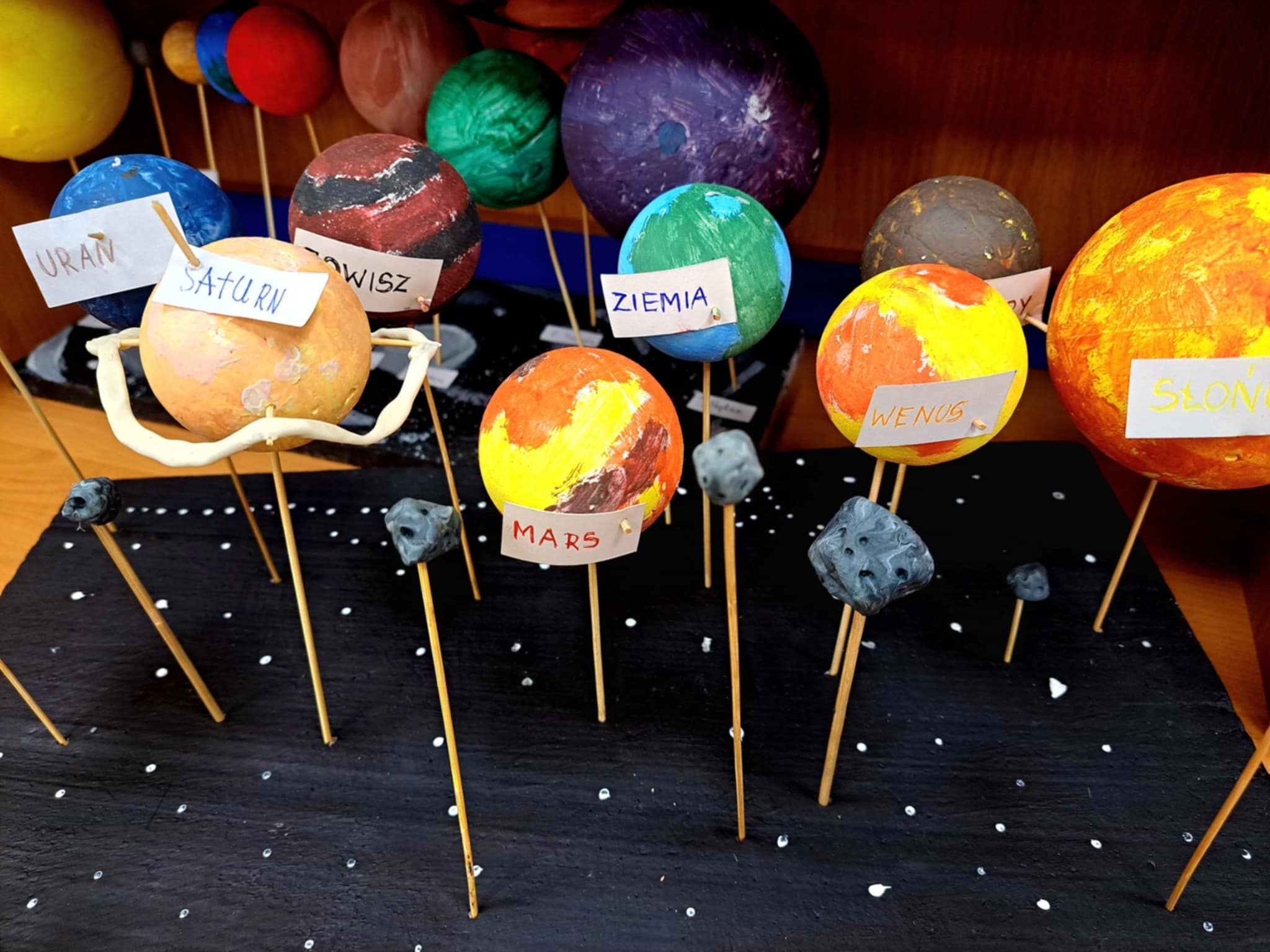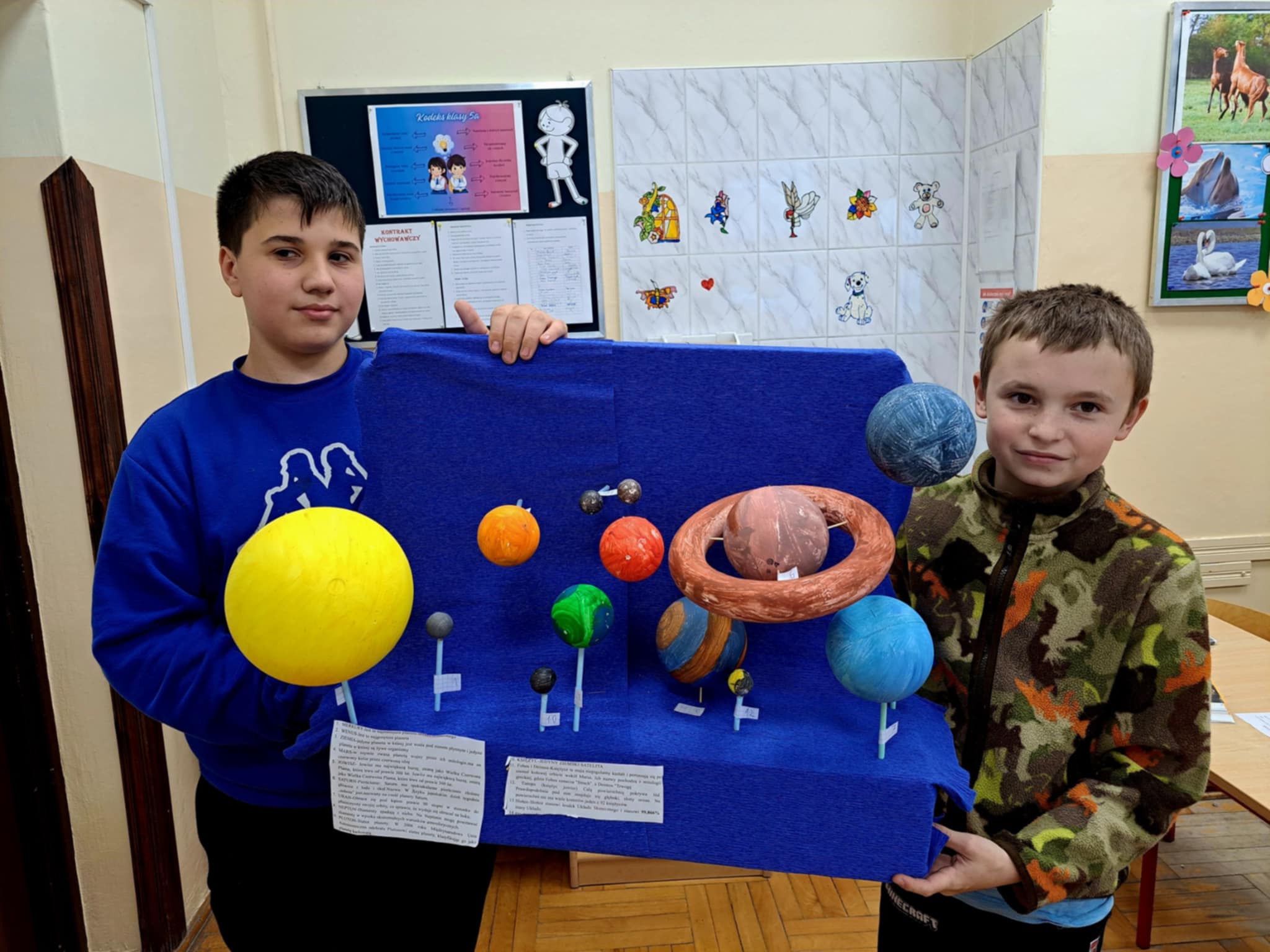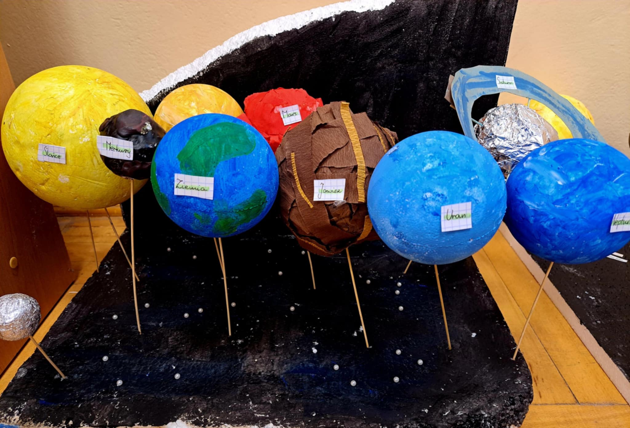 Uczniowie klas szóstych w ramach omawianych zagadnień z geografii dotyczących Wszechświata wykonali piękne modele przedstawiające Nasz Układ Słoneczny. Wszystko przygotowali własnoręcznie wykorzystując tutaj różnego rodzaju materiały. Niektóre prace posiadają swoje oświetlenie co bardzo urealnia wyobrażenie o kosmosie. Wśród modeli są i takie, które mają statki kosmiczne, ufoludków, meteoryty i wile innych elementów, które tam wysoko mogą zobaczyć astronauci i naukowcy.