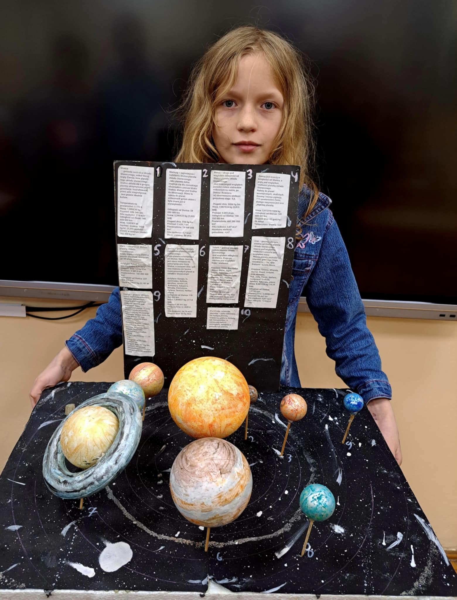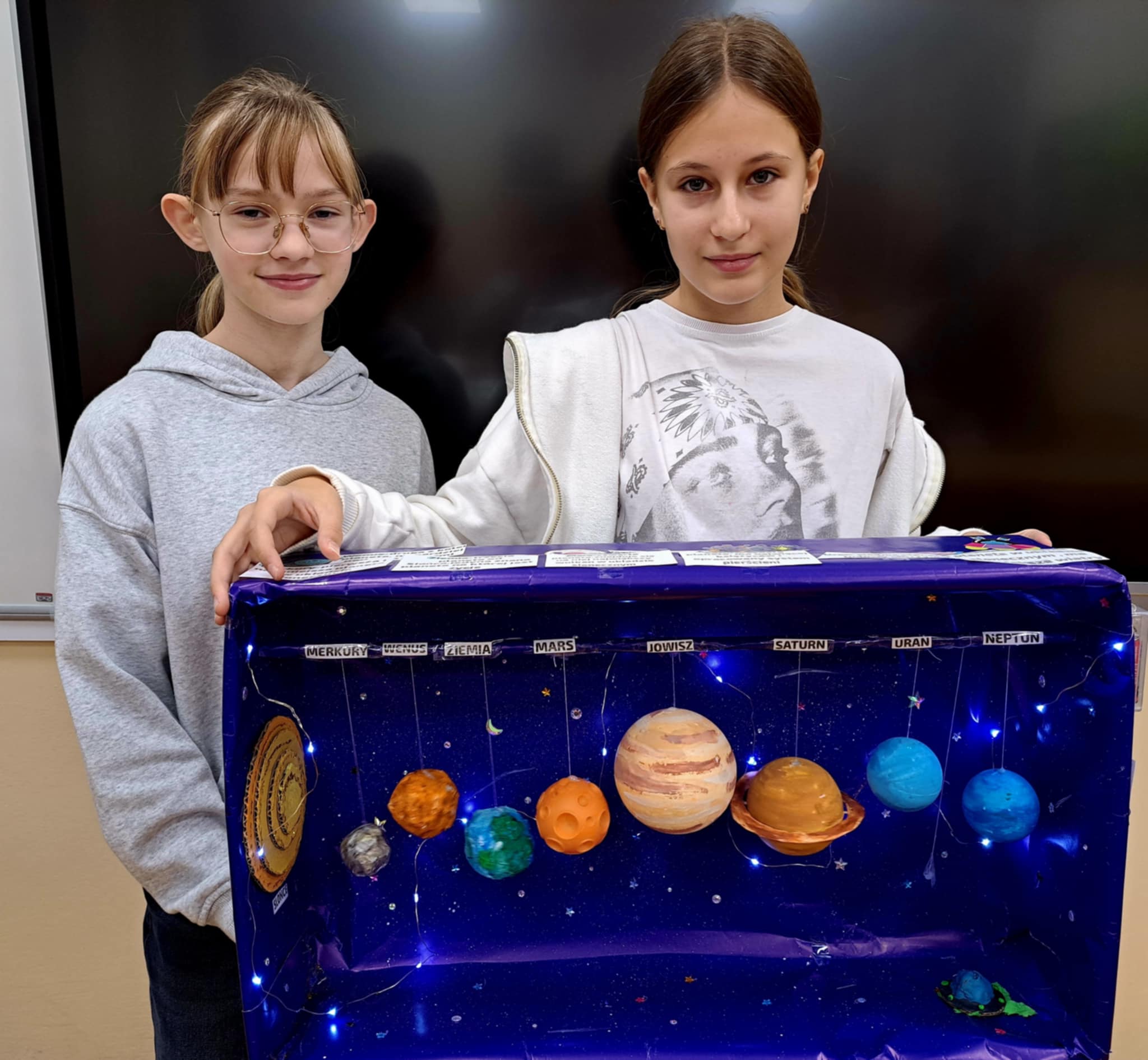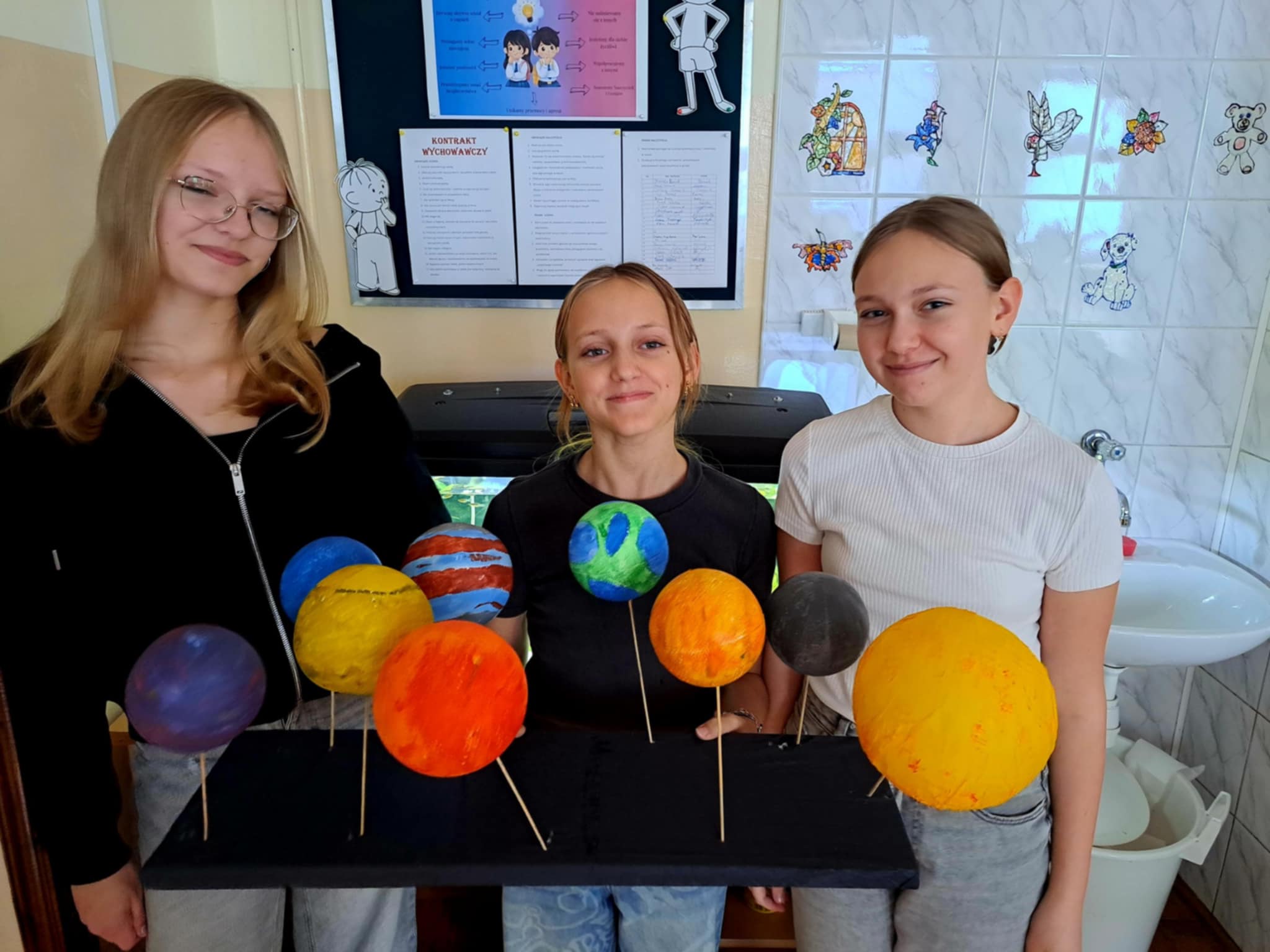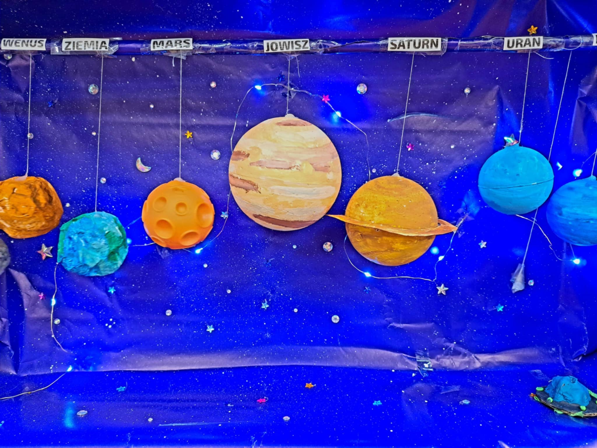 Uczniowie klas szóstych w ramach omawianych zagadnień z geografii dotyczących Wszechświata wykonali piękne modele przedstawiające Nasz Układ Słoneczny. Wszystko przygotowali własnoręcznie wykorzystując tutaj różnego rodzaju materiały. Niektóre prace posiadają swoje oświetlenie co bardzo urealnia wyobrażenie o kosmosie. Wśród modeli są i takie, które mają statki kosmiczne, ufoludków, meteoryty i wile innych elementów, które tam wysoko mogą zobaczyć astronauci i naukowcy.