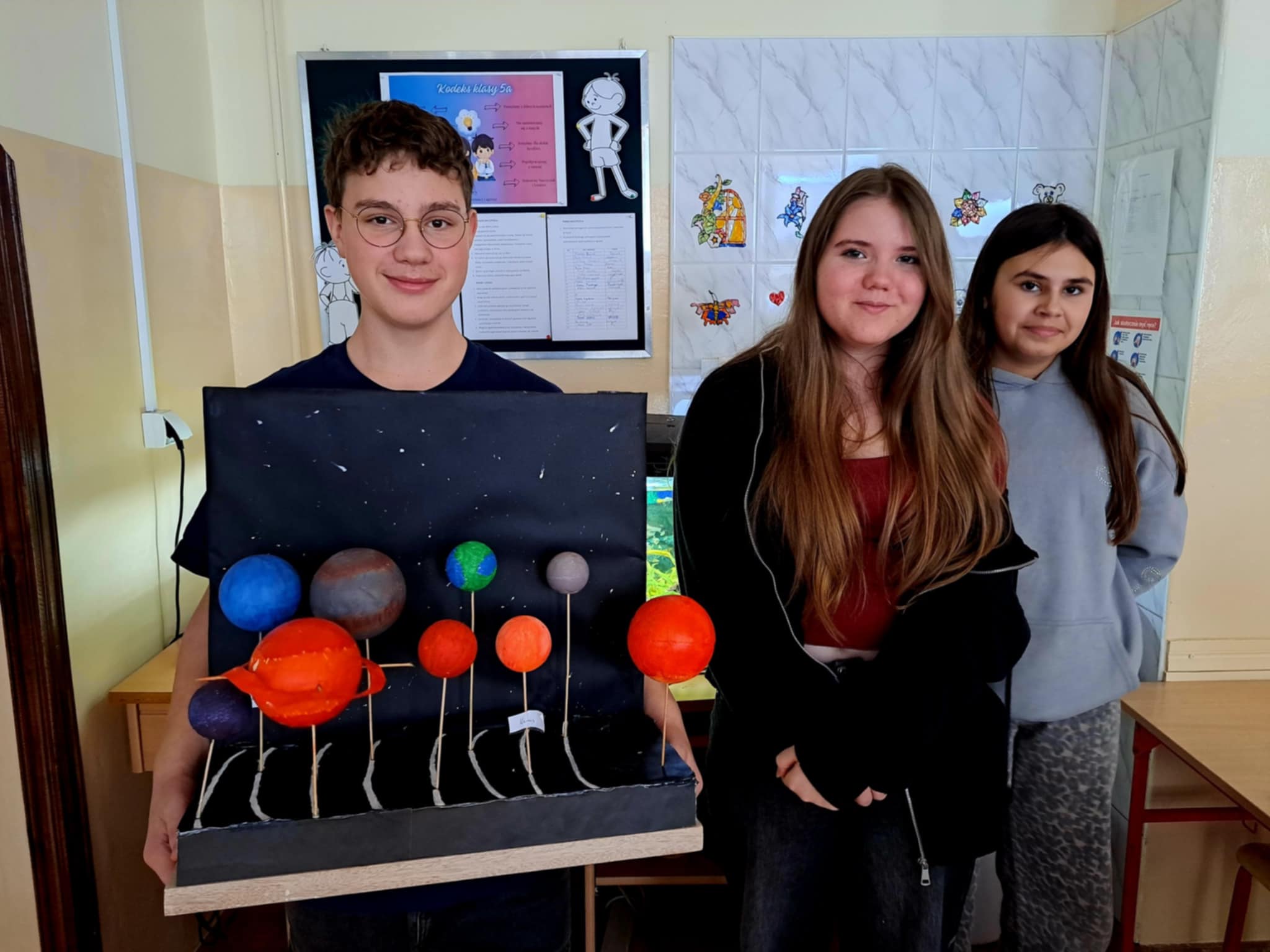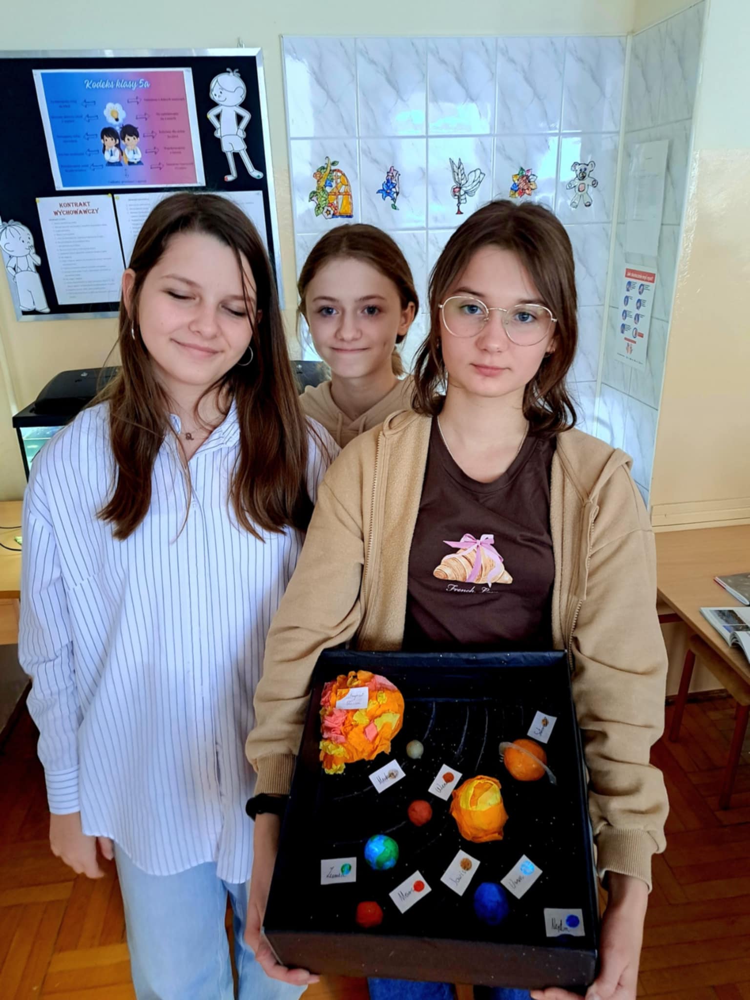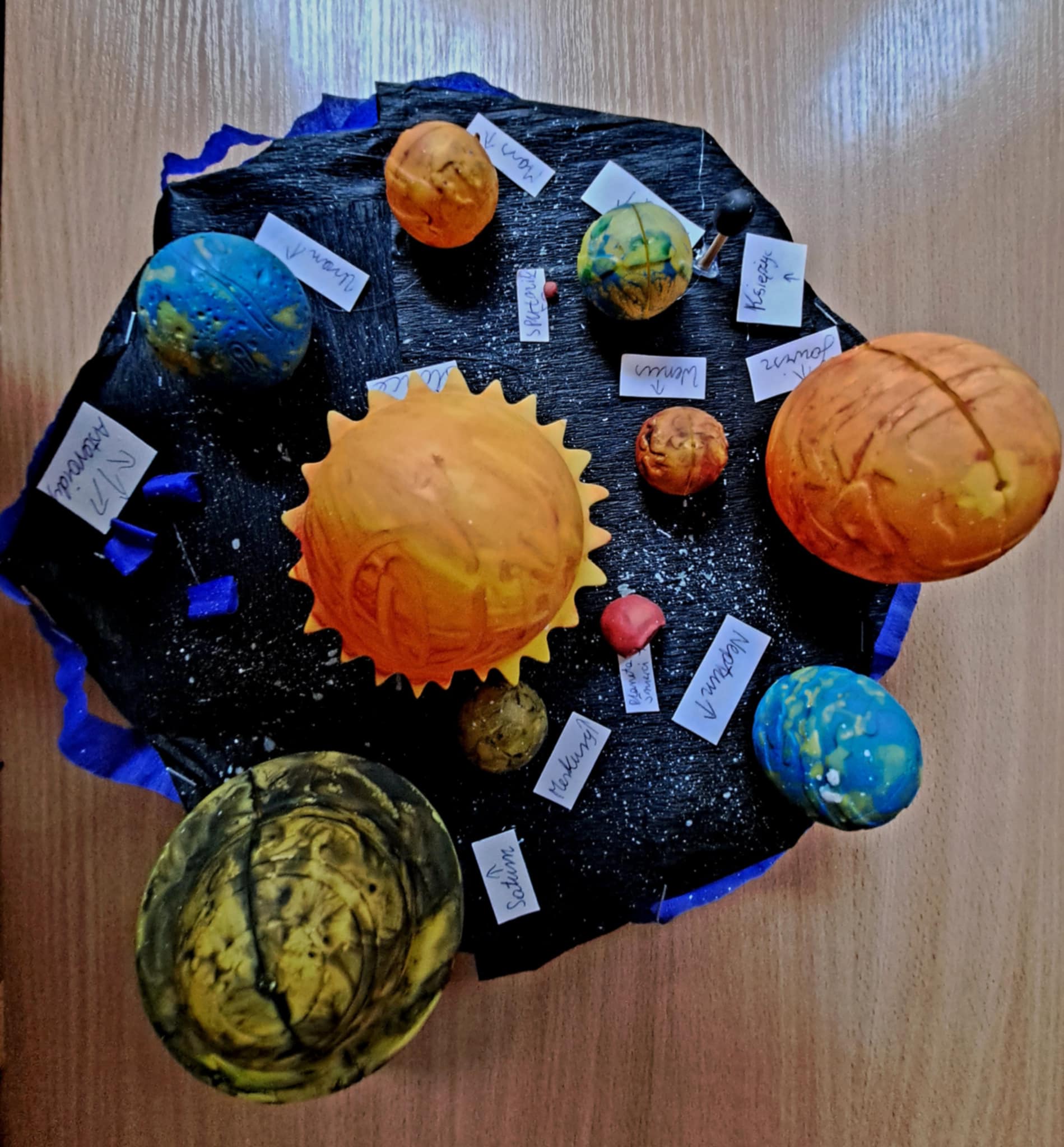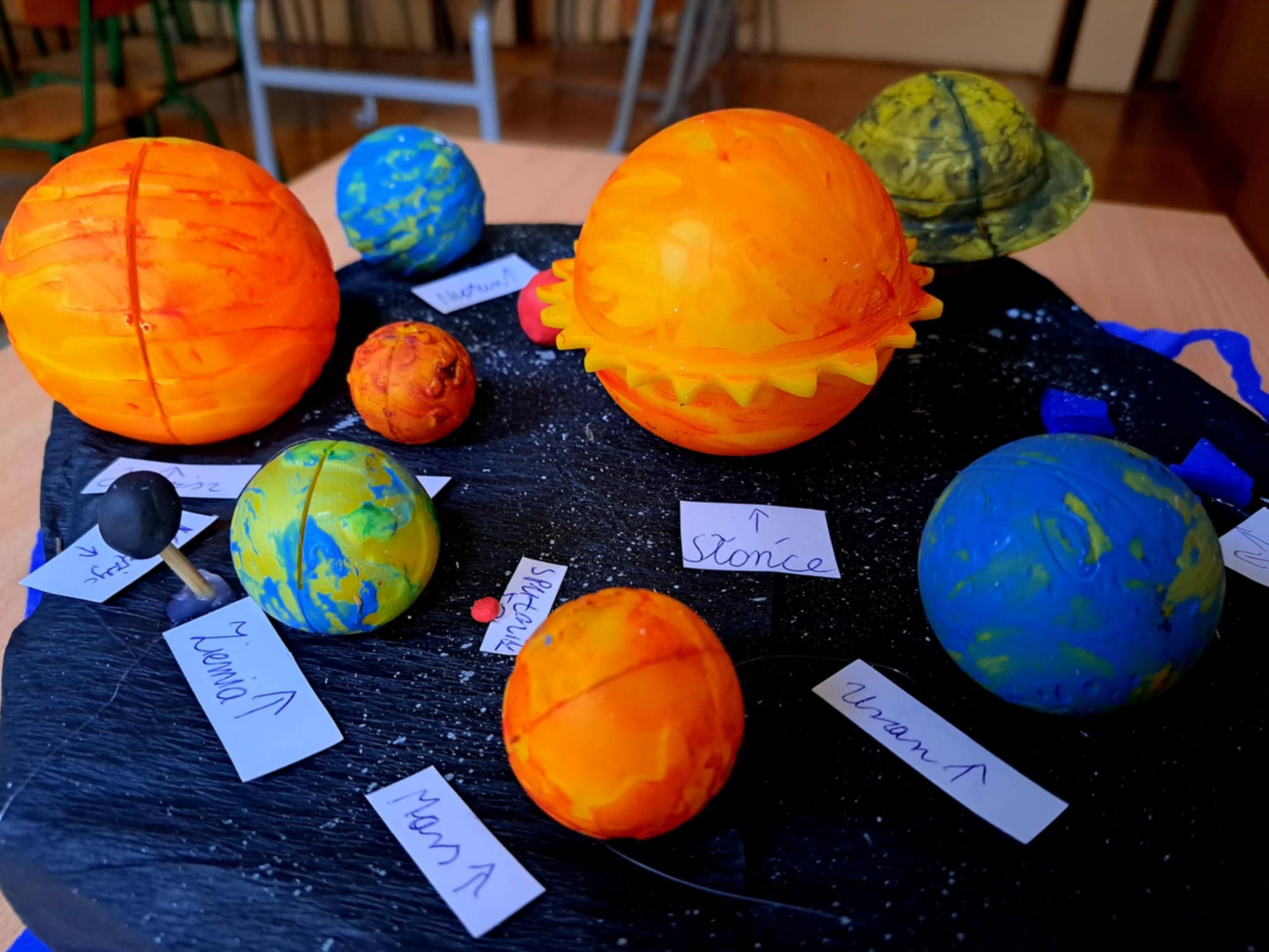 Uczniowie klas szóstych w ramach omawianych zagadnień z geografii dotyczących Wszechświata wykonali piękne modele przedstawiające Nasz Układ Słoneczny. Wszystko przygotowali własnoręcznie wykorzystując tutaj różnego rodzaju materiały. Niektóre prace posiadają swoje oświetlenie co bardzo urealnia wyobrażenie o kosmosie. Wśród modeli są i takie, które mają statki kosmiczne, ufoludków, meteoryty i wile innych elementów, które tam wysoko mogą zobaczyć astronauci i naukowcy.
