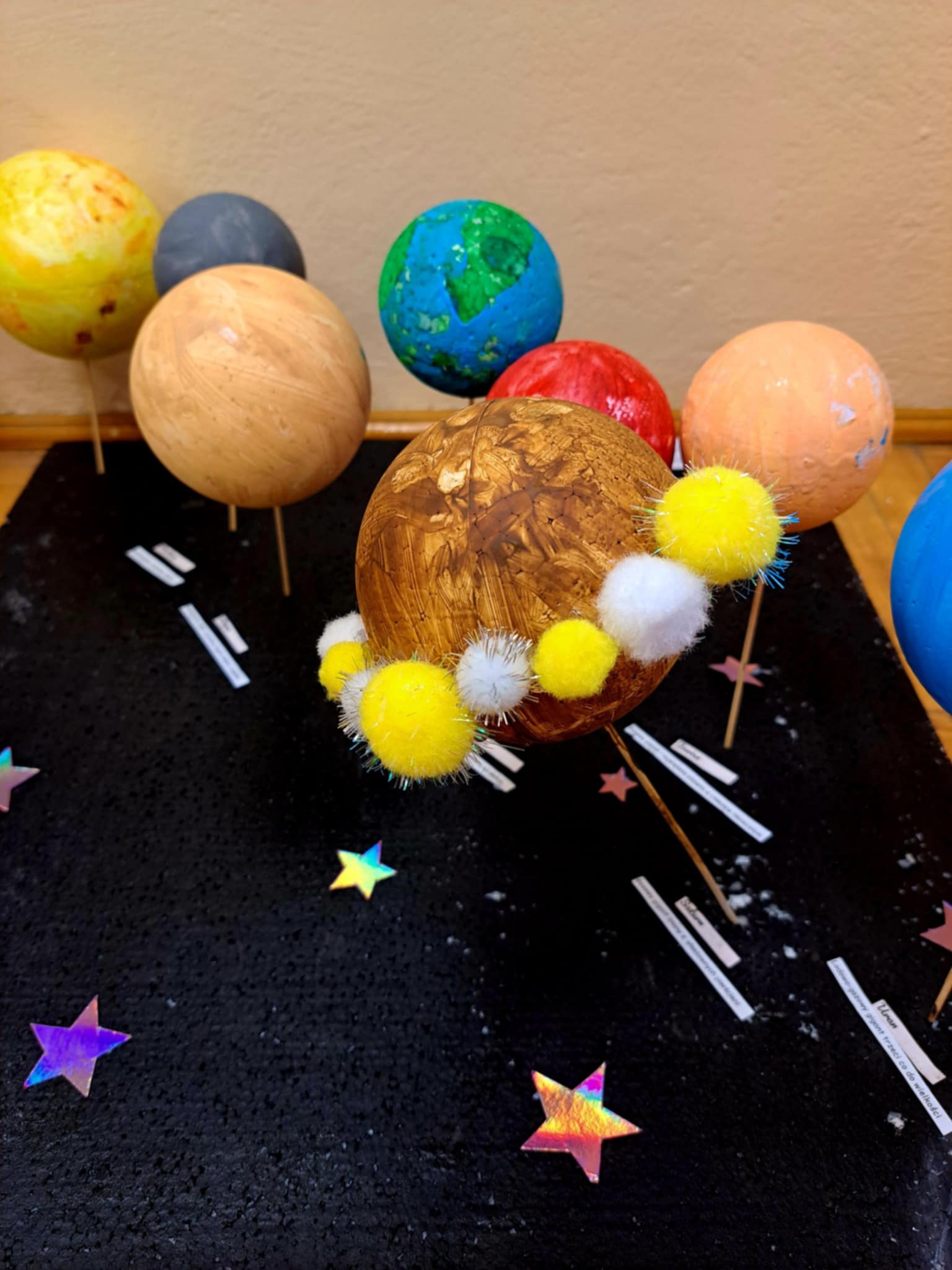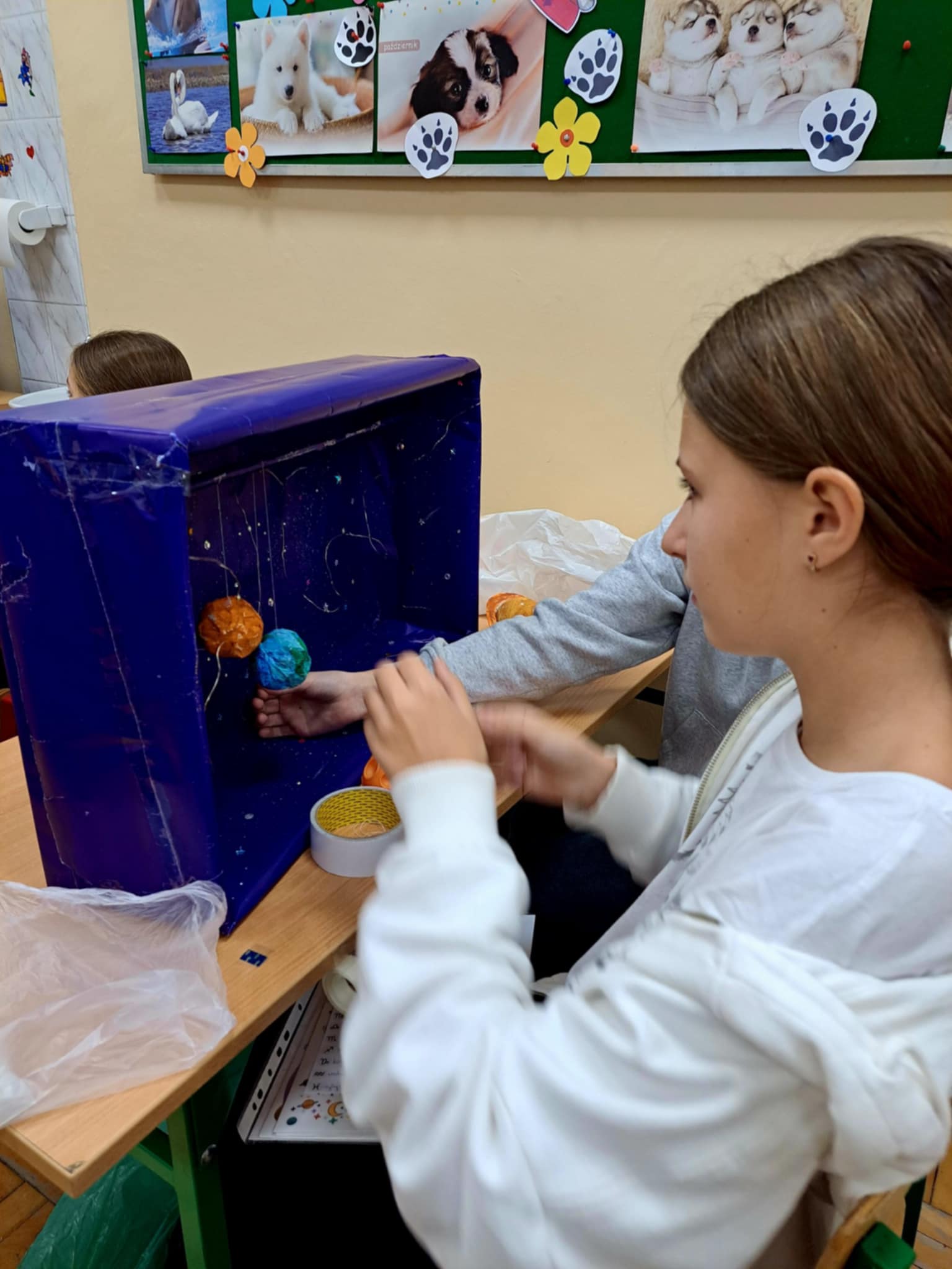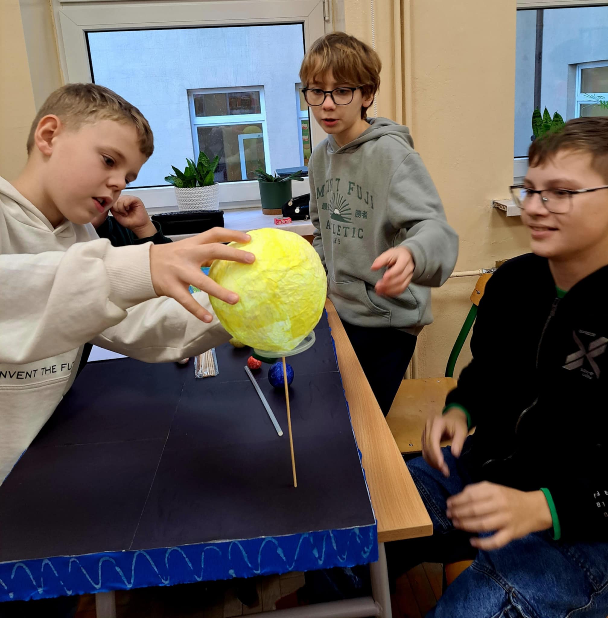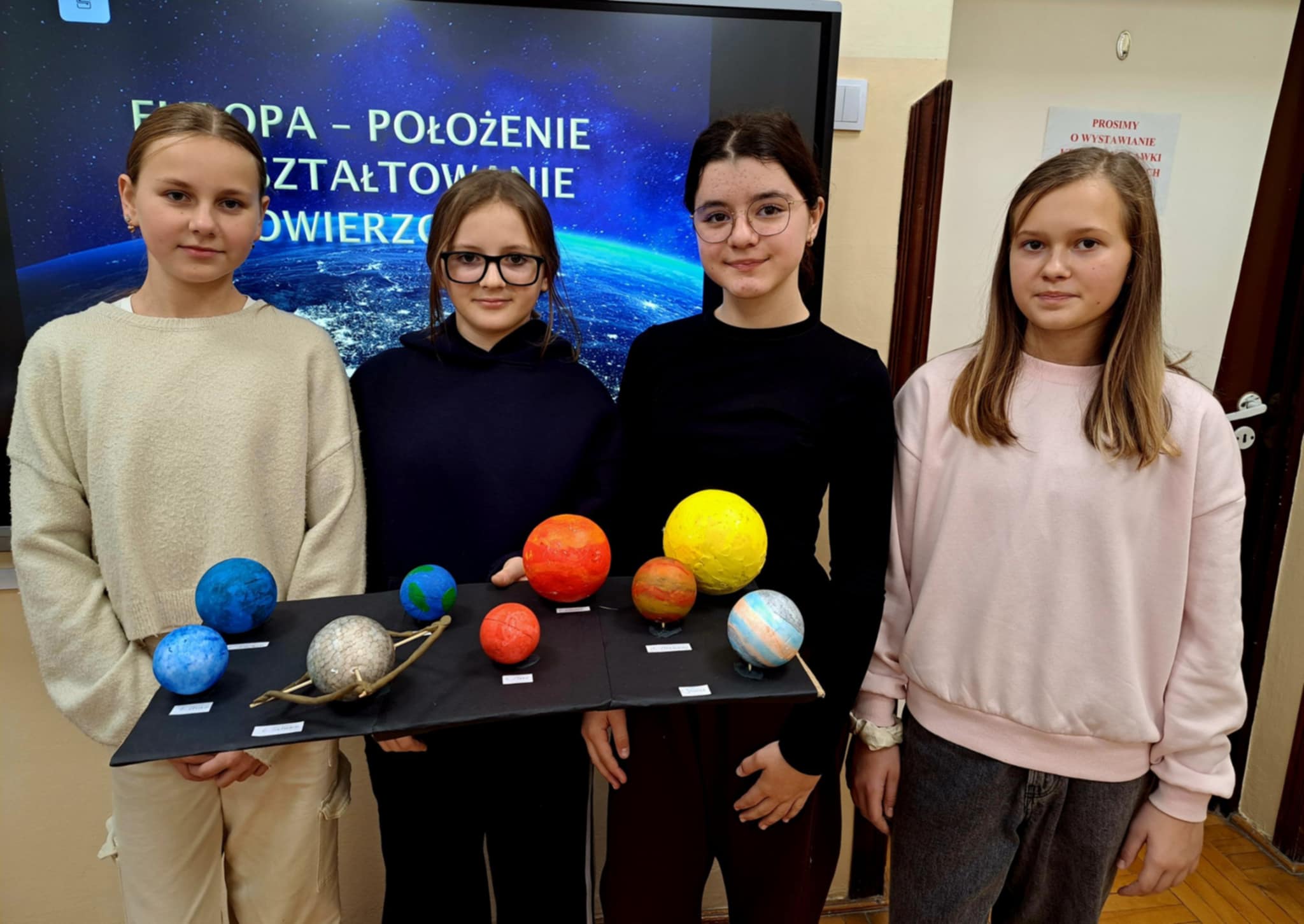 Uczniowie klas szóstych w ramach omawianych zagadnień z geografii dotyczących Wszechświata wykonali piękne modele przedstawiające Nasz Układ Słoneczny. Wszystko przygotowali własnoręcznie wykorzystując tutaj różnego rodzaju materiały. Niektóre prace posiadają swoje oświetlenie co bardzo urealnia wyobrażenie o kosmosie. Wśród modeli są i takie, które mają statki kosmiczne, ufoludków, meteoryty i wile innych elementów, które tam wysoko mogą zobaczyć astronauci i naukowcy.