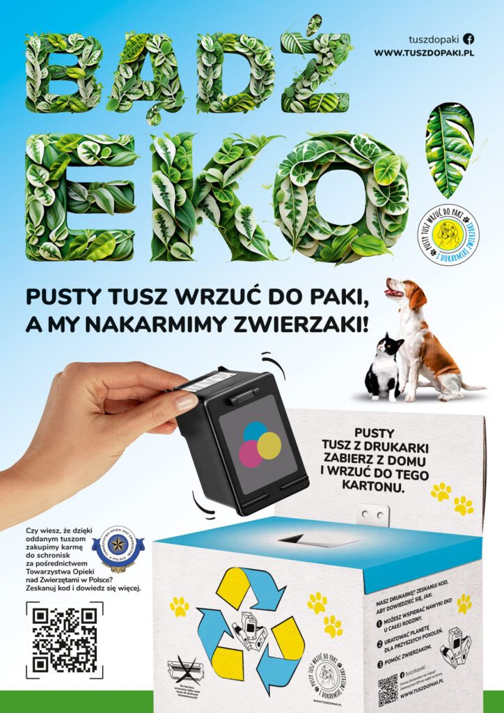 Wiele szkół w Polsce angażuje się w kampanię edukacyjno-charytatywną, której celem jest edukacja ekologiczna dzieci, a dzięki nim również dorosłych, w zakresie segregacji tuszów do drukarek – tzw. kartridży. Zachęcamy uczniów do przyniesienia z domu zużytych tuszów z drukarek atramentowych i wrzucenia ich do przygotowanych kartonów. Zebrane w ten sposób odpady przekażemy do recyklingu i zakupimy karmę dla zwierzaków ze schronisk.  Im więcej tuszów zbierzemy, tym więcej karmy trafi do ich misek.