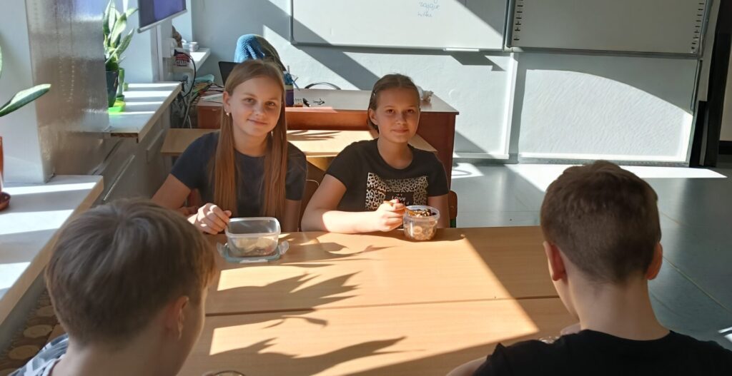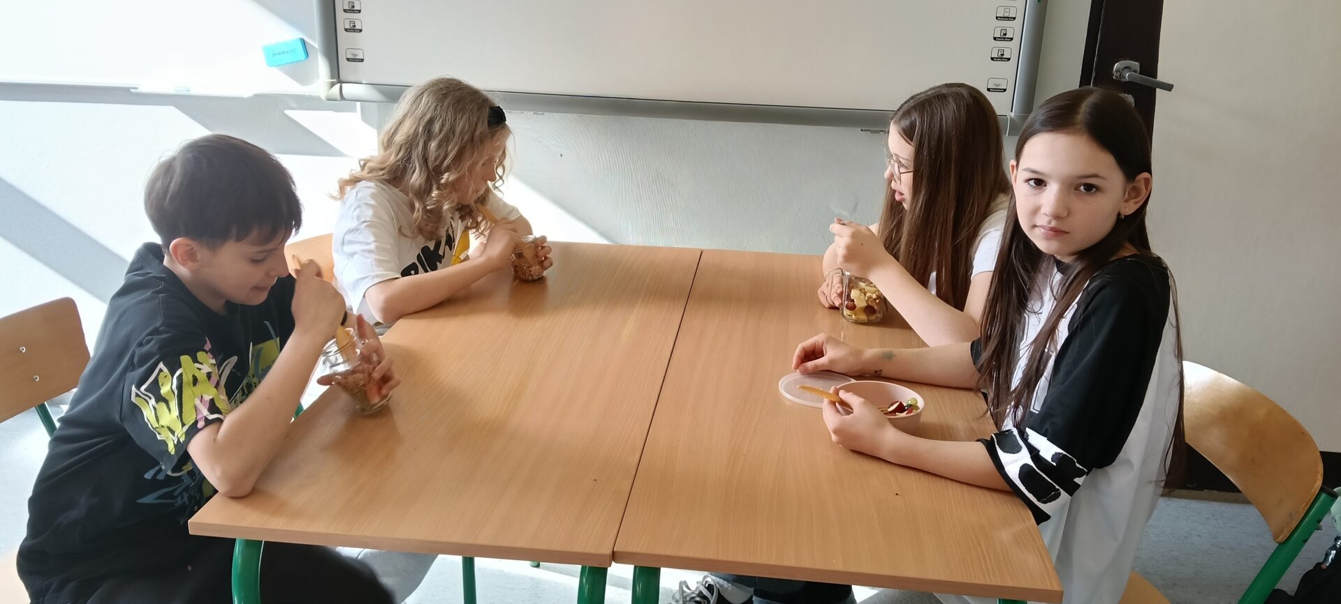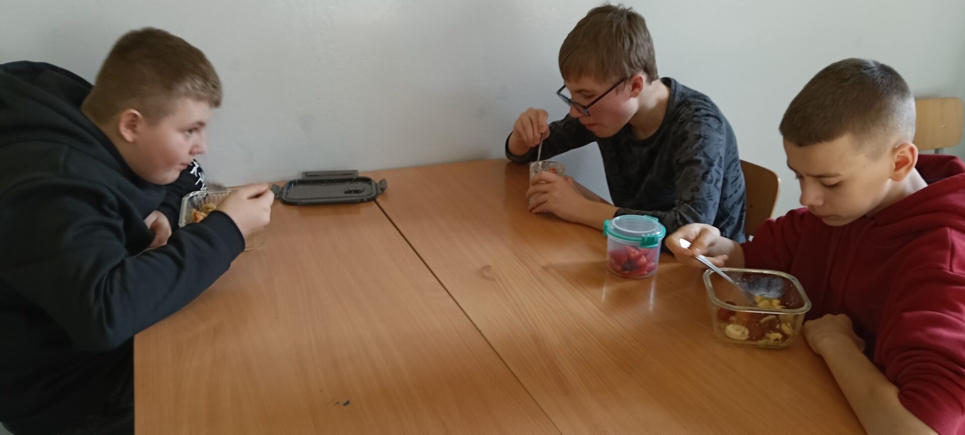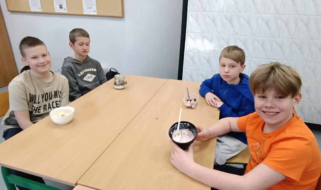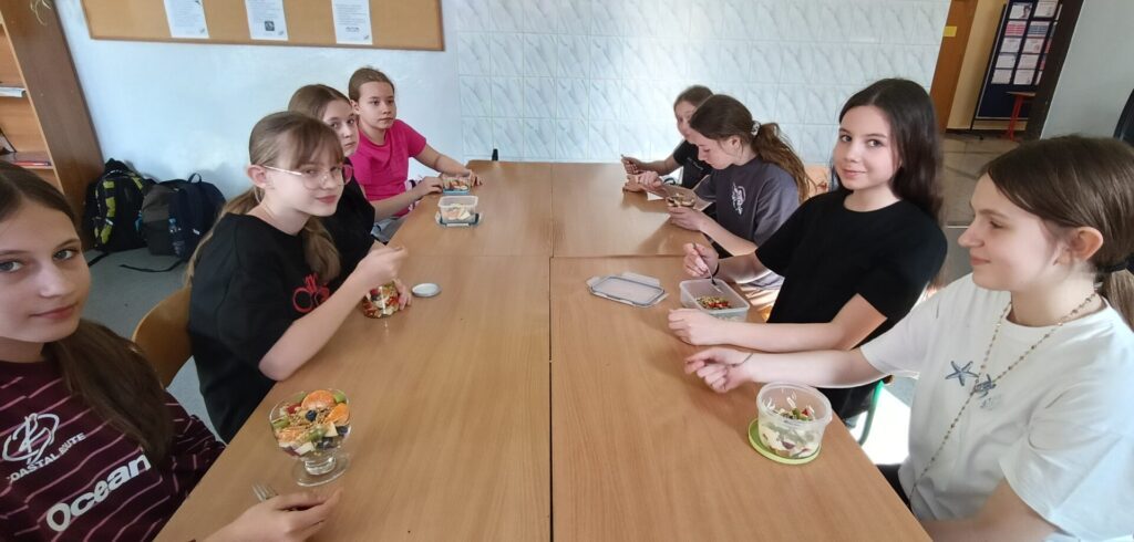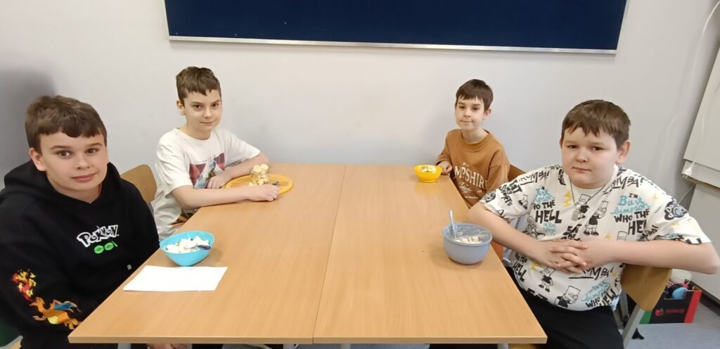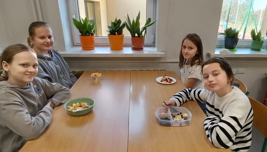 W ramach programu „Trzymaj formę” uczniowie z klas 4-6 zamieniali się w mistrzów zdrowych smaków – przygotowywali sałatki lub desery owocowe. Zajęcia miały zachęcać do konsumpcji zdrowych przekąsek na „podwieczorek”😊, podczas pobytu w szkole lub w trakcie oglądania filmów (jako alternatywa dla podjadania słodyczy, popcornu i chipsów). Większość stwierdziła, że było bardzo smacznie, kolorowo, częściej będą sięgali po takie zdrowe smakołyki i samodzielnie przygotują podobne w domach.