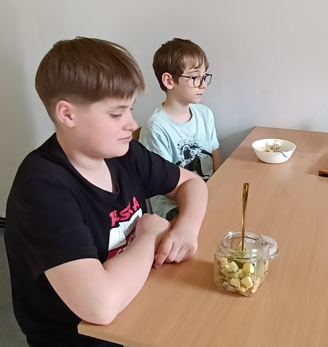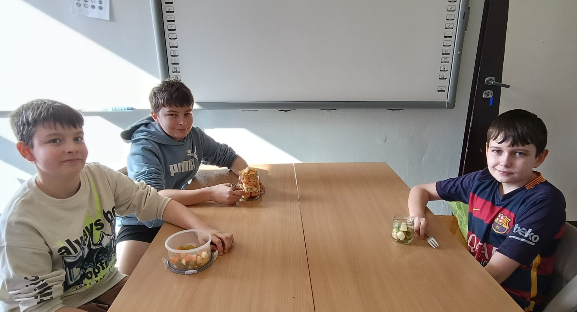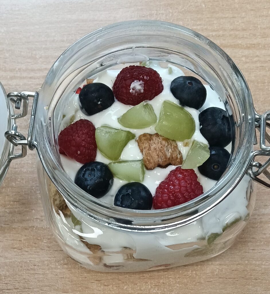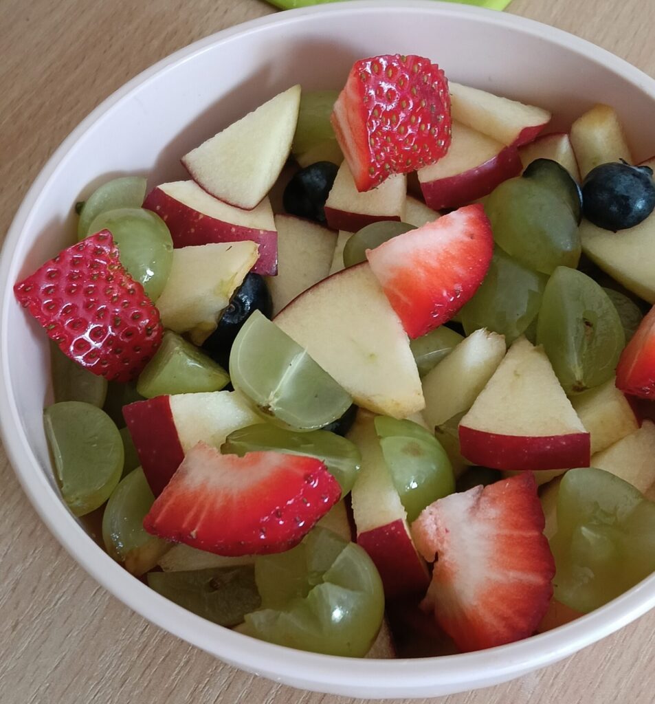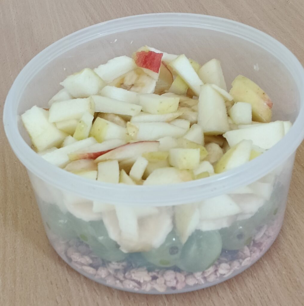 W ramach programu „Trzymaj formę” uczniowie z klas 4-6 zamieniali się w mistrzów zdrowych smaków – przygotowywali sałatki lub desery owocowe. Zajęcia miały zachęcać do konsumpcji zdrowych przekąsek na „podwieczorek”😊, podczas pobytu w szkole lub w trakcie oglądania filmów (jako alternatywa dla podjadania słodyczy, popcornu i chipsów). Większość stwierdziła, że było bardzo smacznie, kolorowo, częściej będą sięgali po takie zdrowe smakołyki i samodzielnie przygotują podobne w domach.