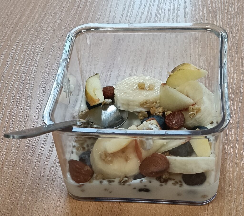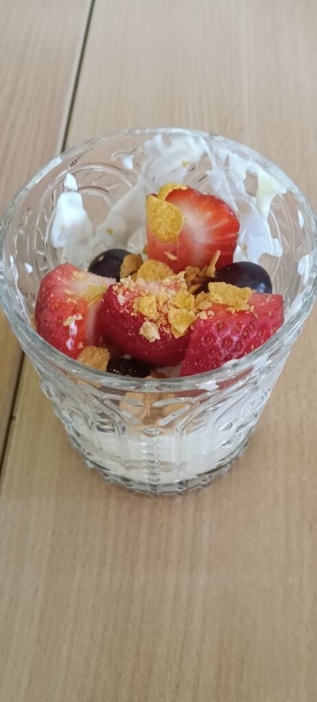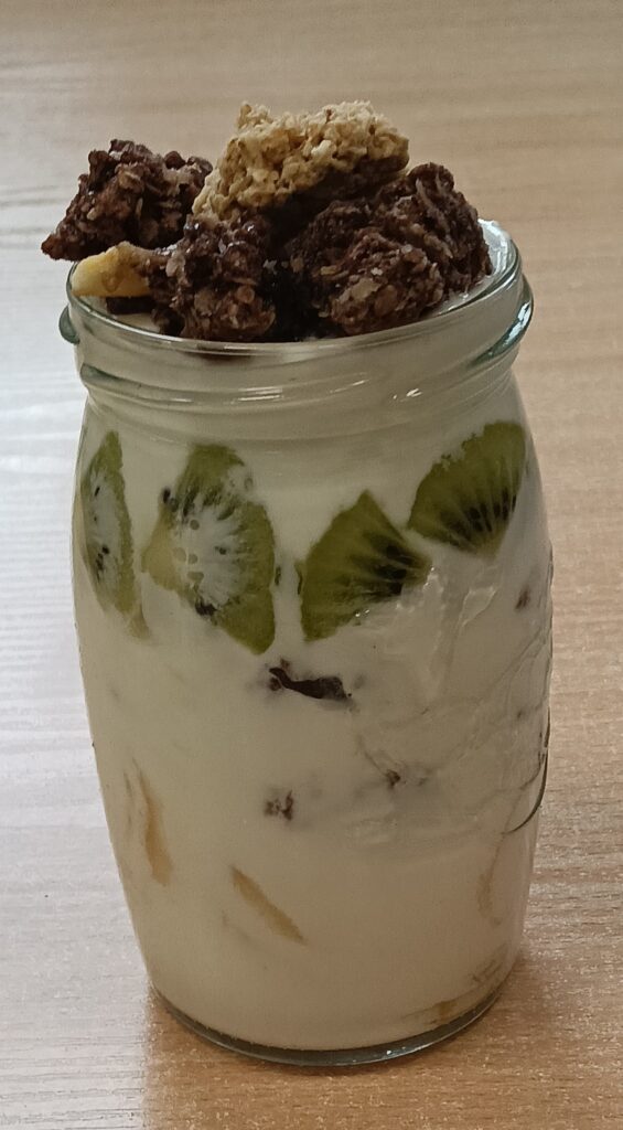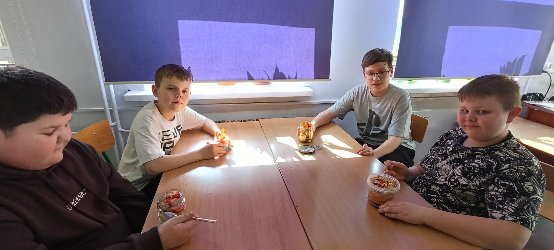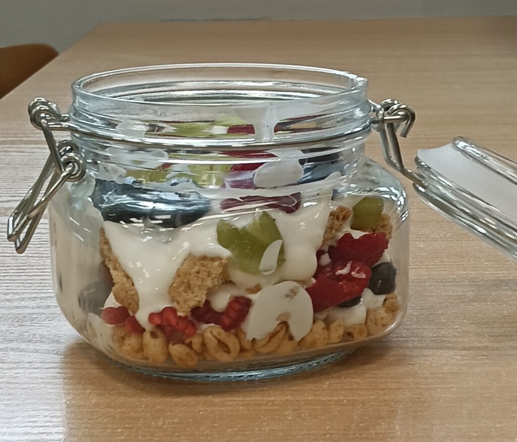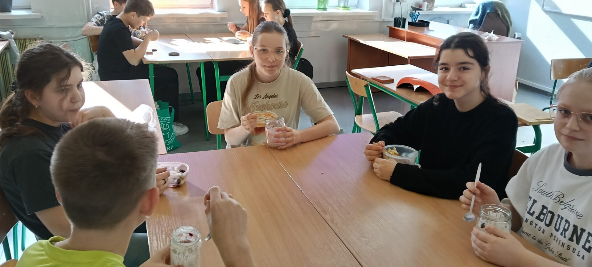 W ramach programu „Trzymaj formę” uczniowie z klas 4-6 zamieniali się w mistrzów zdrowych smaków – przygotowywali sałatki lub desery owocowe. Zajęcia miały zachęcać do konsumpcji zdrowych przekąsek na „podwieczorek”😊, podczas pobytu w szkole lub w trakcie oglądania filmów (jako alternatywa dla podjadania słodyczy, popcornu i chipsów). Większość stwierdziła, że było bardzo smacznie, kolorowo, częściej będą sięgali po takie zdrowe smakołyki i samodzielnie przygotują podobne w domach.