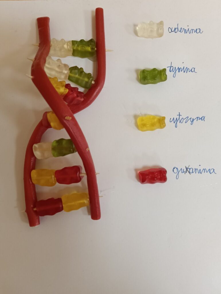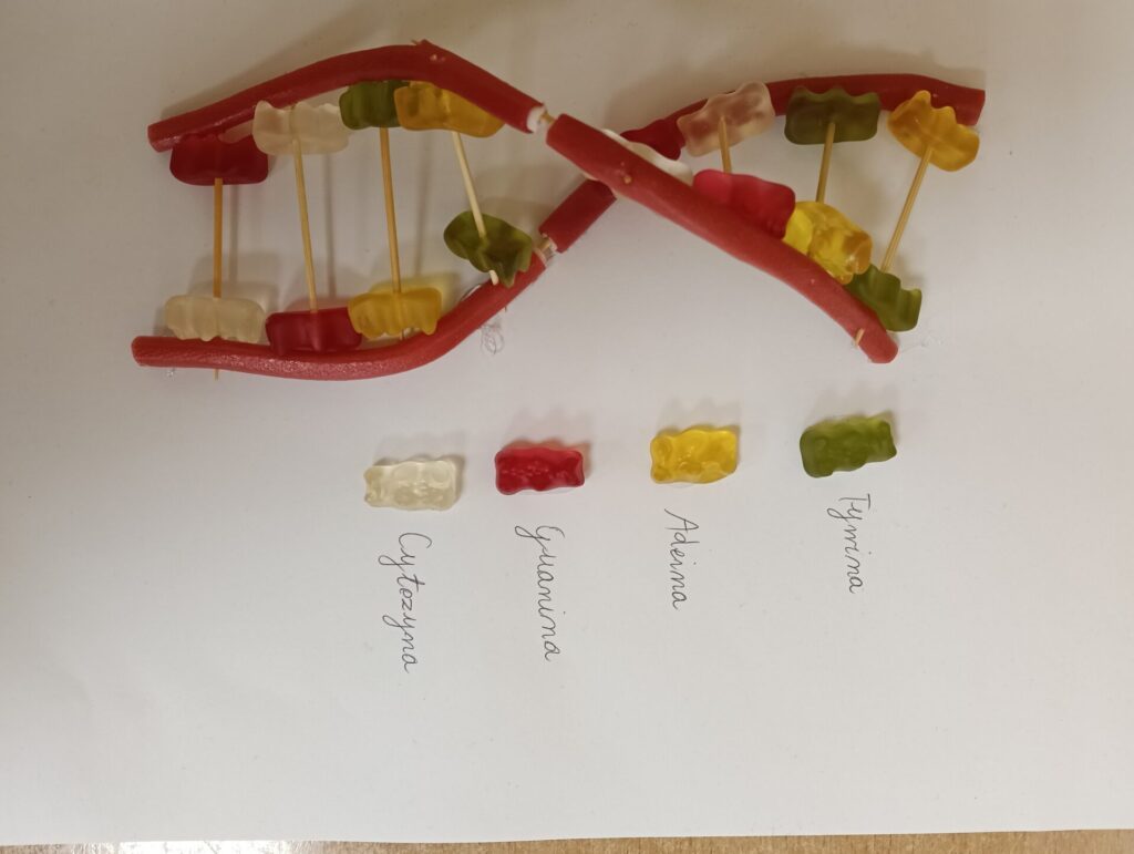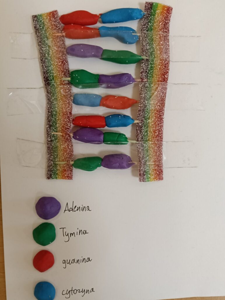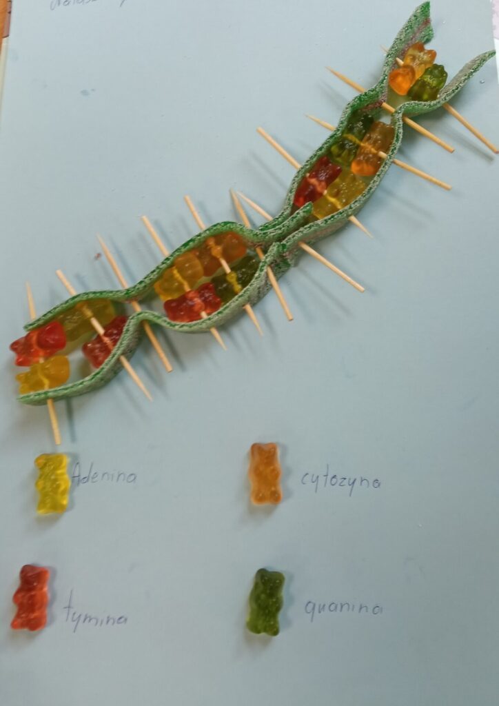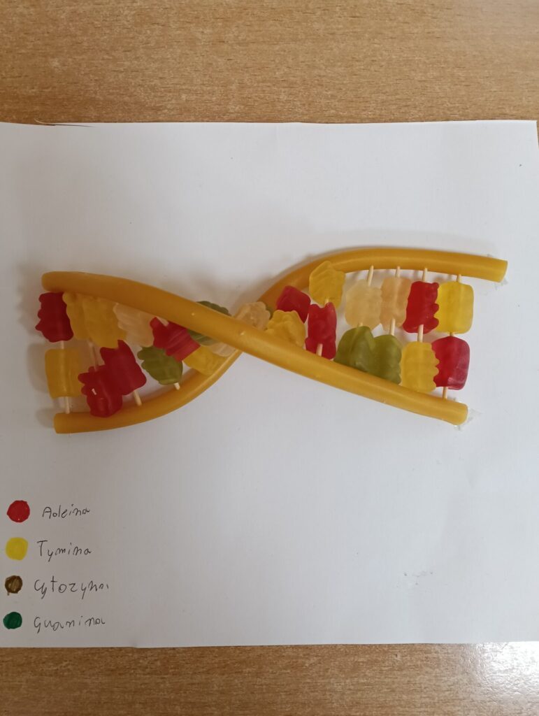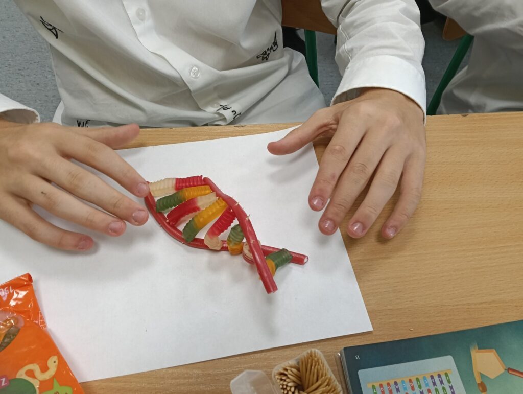 Na lekcjach biologii w kl. 8a i 8b teoria spotkała się z praktyką – uczniowie budowali modele DNA, m. in. z żelków! Ponadto z patyczków do uszu, kolorowych rurek, drucików lub innych materiałów dekoracyjnych. To właśnie ten związek jest nośnikiem informacji genetycznej – są w nim zapisane informacje o cechach organizmu w postaci genów. Uczniowie utrwalili budowę nukleotydu DNA oraz zasadę komplementarności. Było twórczo, wesoło, a na koniec smacznie! Galeria ukazuje uczniów podczas pracy oraz efekty.