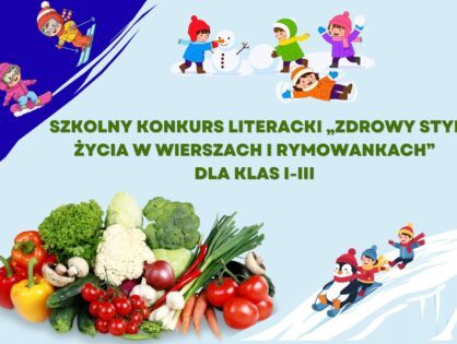 W ramach Ogólnopolskiego Projektu Edukacyjnego „ZDROWE ŻYCIE I PIERWSZA POMOC” zachęcamy wszystkich Uczniów klas 1-3 do wzięcia udziału w SZKOLNYM KONKURSIE LITERACKIM „ZDROWY STYL ŻYCIA W WIERSZACH I RYMOWANKACH”. Zadaniem uczestników jest napisanie wiersza lub rymowanki zawierających informacje o zdrowym stylu życia i wartościach odżywczych warzyw i owoców.
