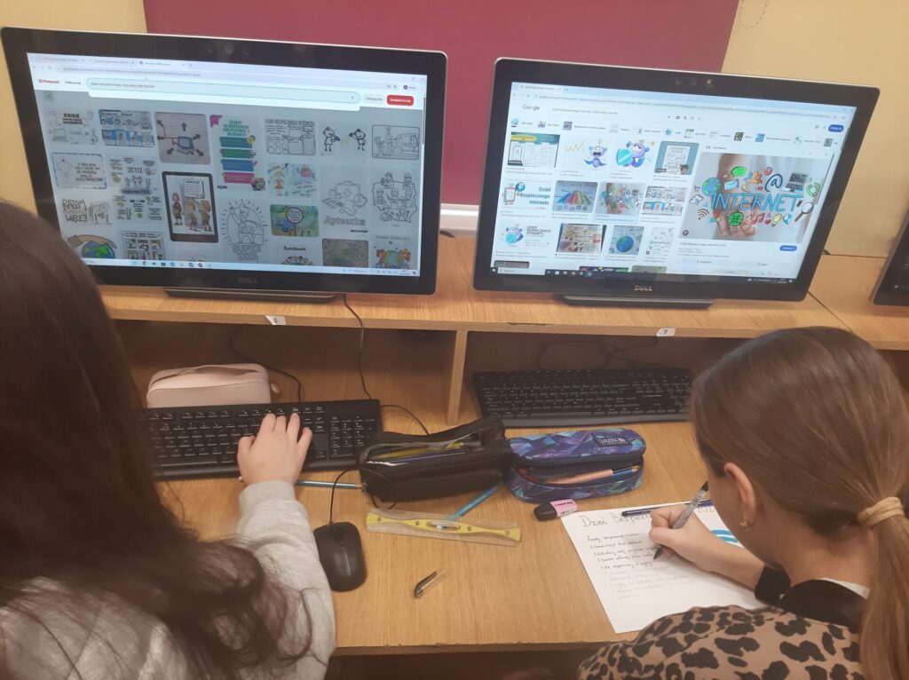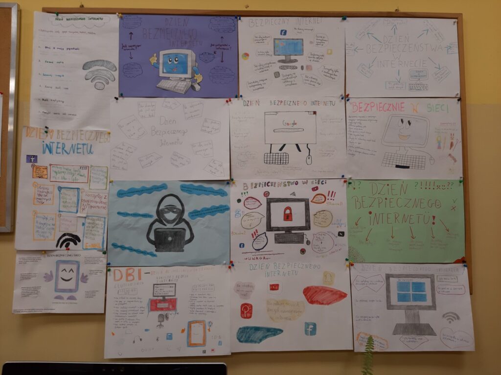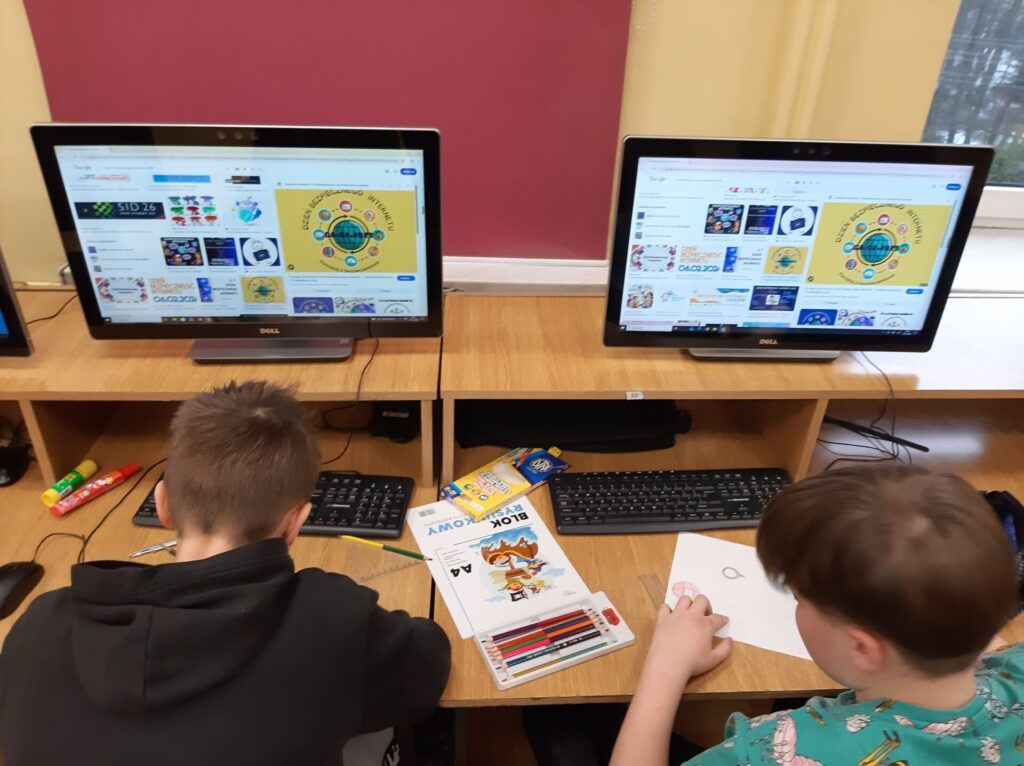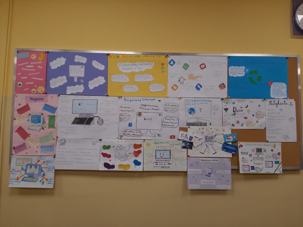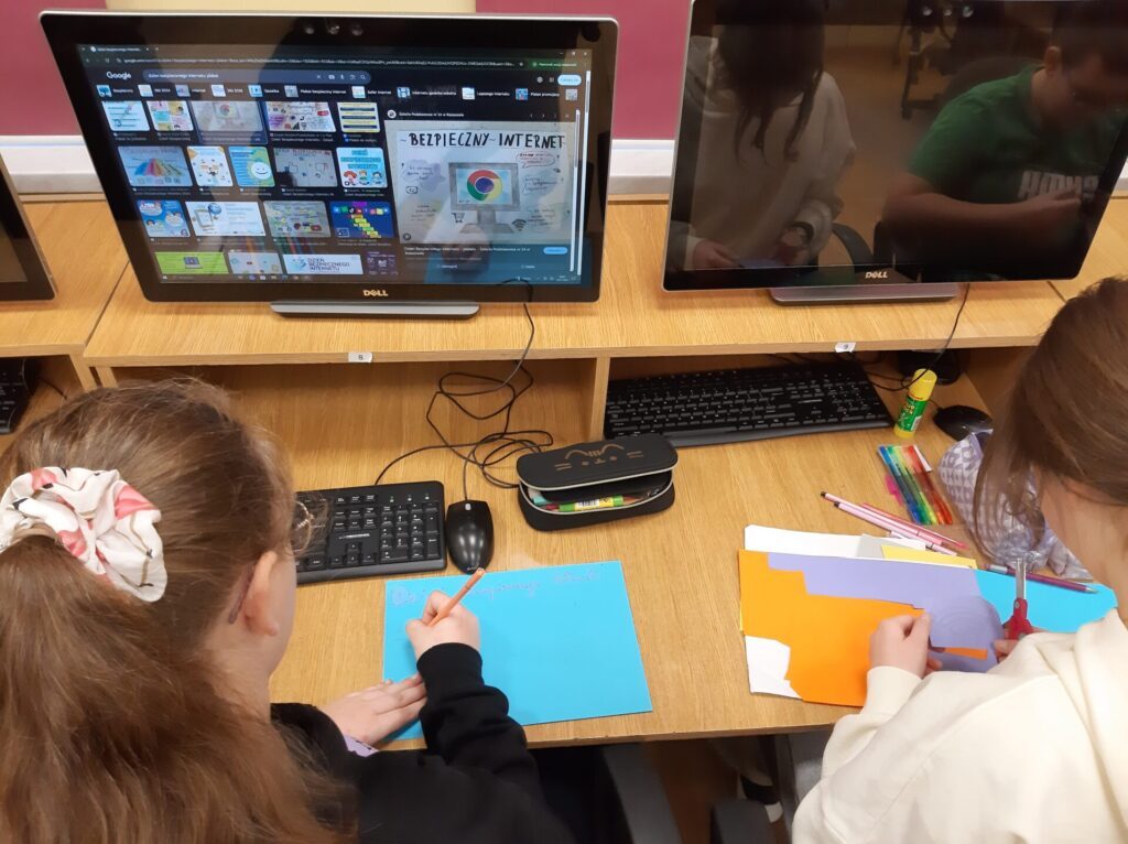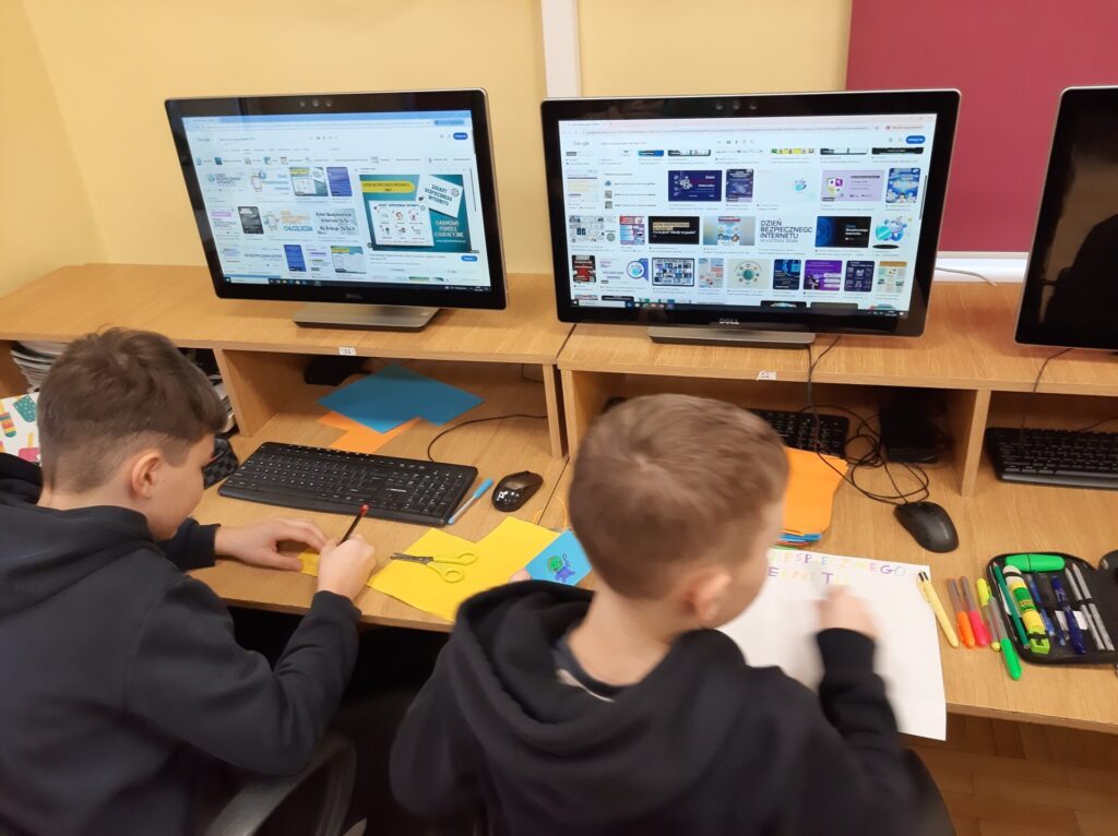 Uczniowie pracowali w grupach, wykonując plakaty tematyczne promujące bezpieczne zachowania w sieci. Dodatkowo rozwiązywali krzyżówki oraz quizy online, które w atrakcyjnej formie utrwalały zdobytą wiedzę. Zajęcia miały charakter aktywizujący i angażujący, sprzyjający współpracy oraz rozwijaniu kompetencji cyfrowych.