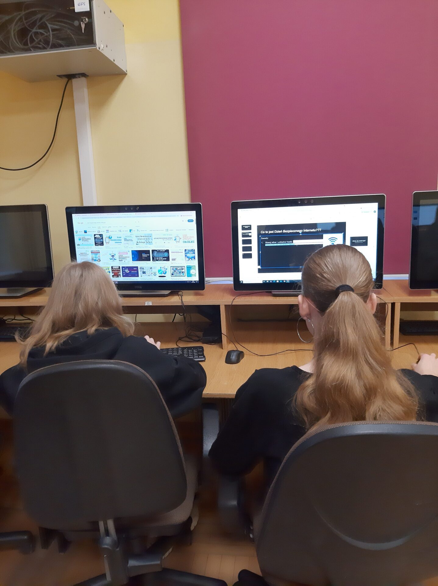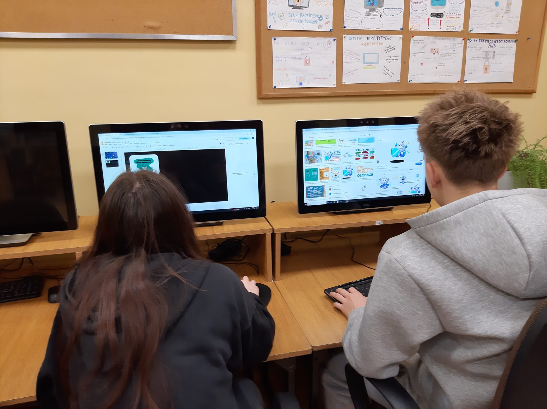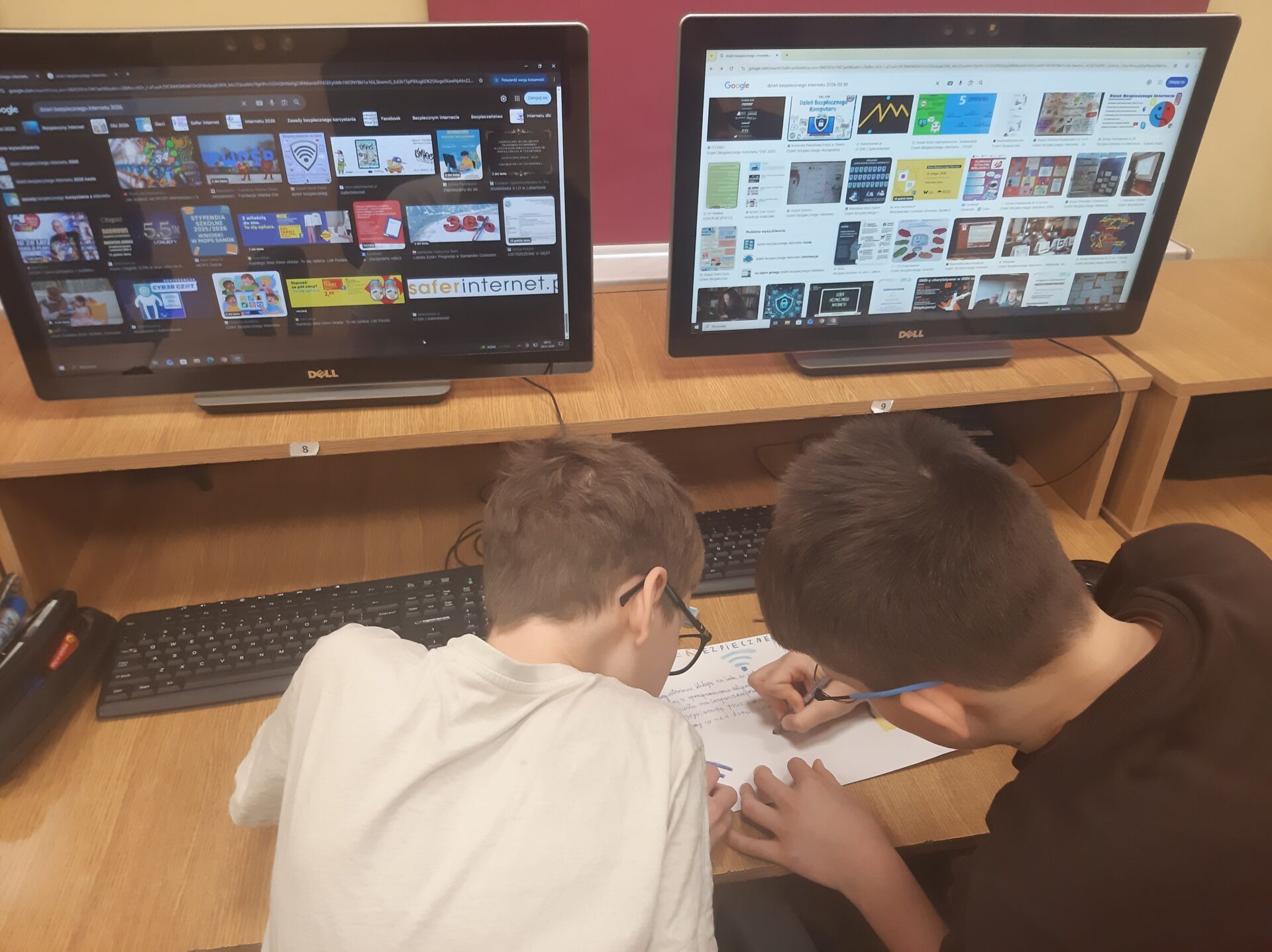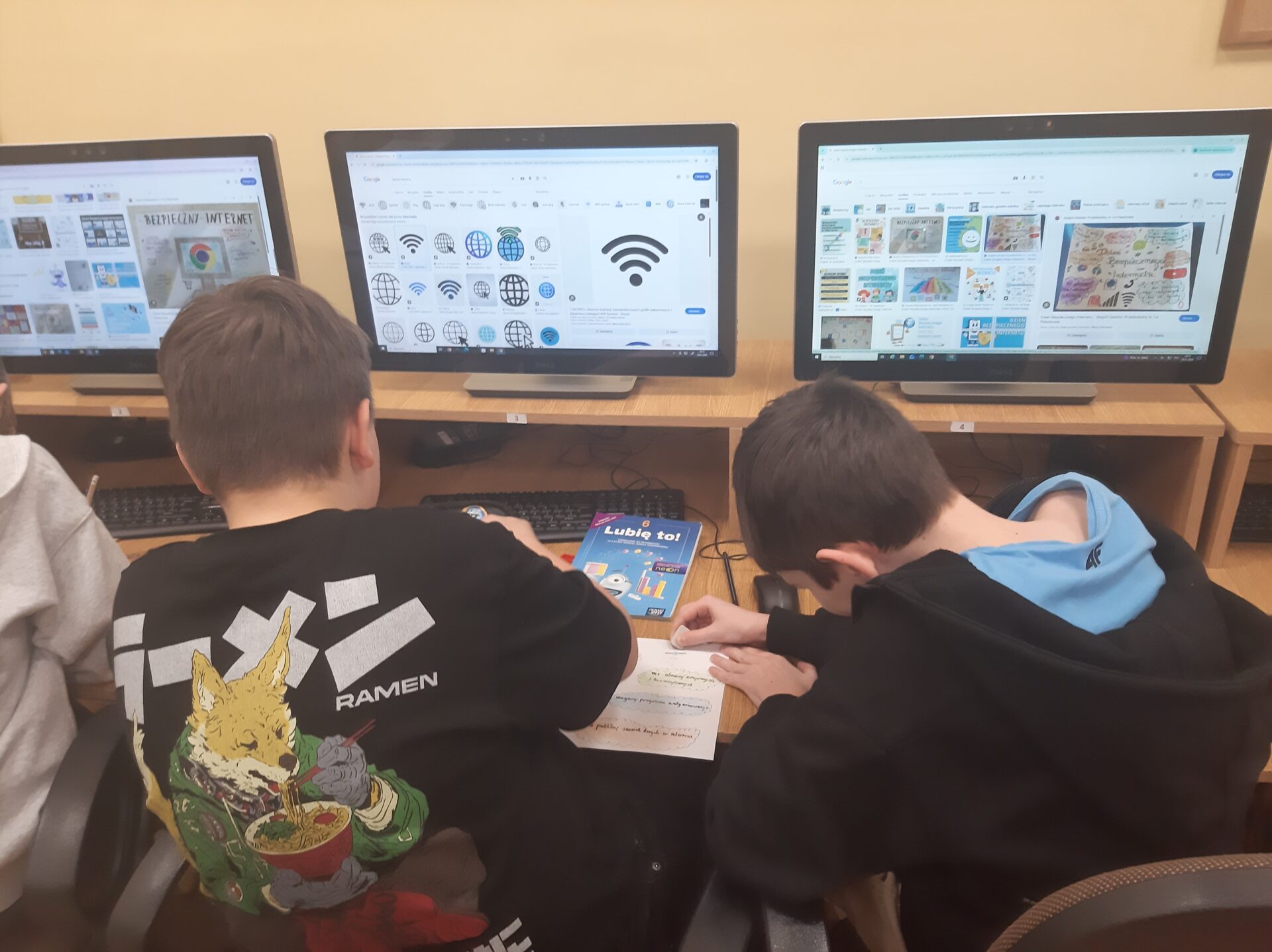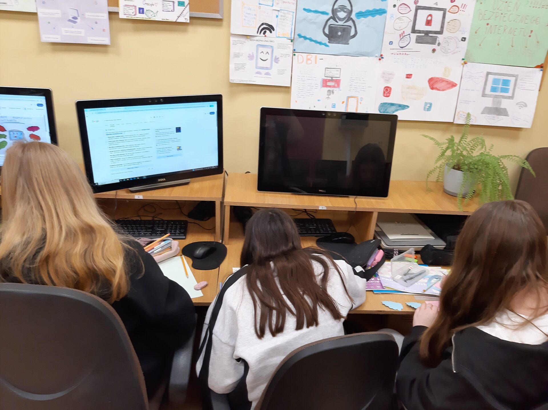 Uczniowie pracowali w grupach, wykonując plakaty tematyczne promujące bezpieczne zachowania w sieci. Dodatkowo rozwiązywali krzyżówki oraz quizy online, które w atrakcyjnej formie utrwalały zdobytą wiedzę. Zajęcia miały charakter aktywizujący i angażujący, sprzyjający współpracy oraz rozwijaniu kompetencji cyfrowych.