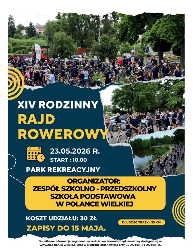 XIV RODZINNY RAJD ROWEROWY – 23.05.2026r. 19 kwietnia 2026 by Beata Borowczyk 2025/2026 REGULAMIN XIV RODZINNEGO RAJDU ROWEROWEGO KARTA ZGŁOSZENIA DO UDZIAŁU W XIV RODZINNYM RAJDZIE ROWEROWYM